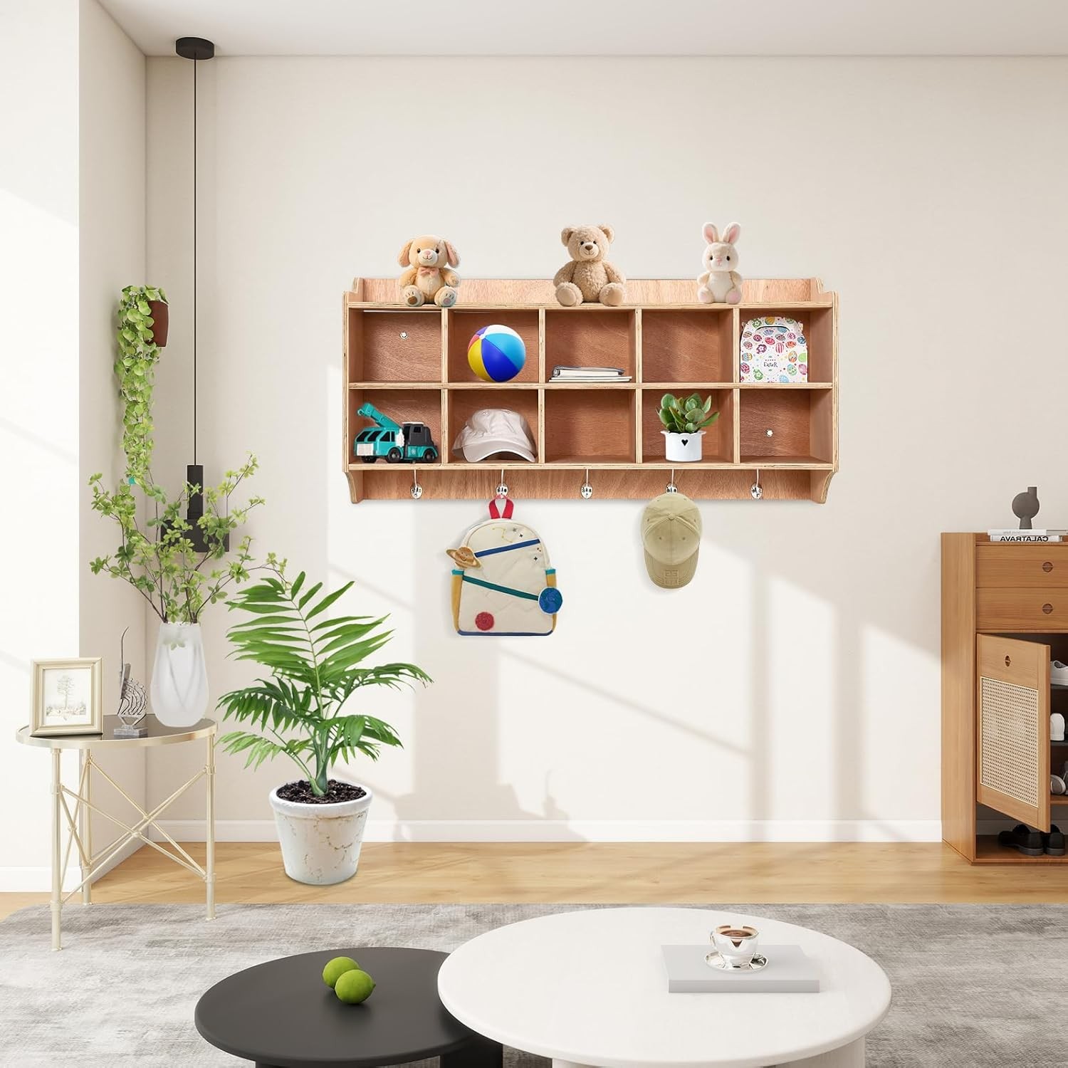 Product description A mple Storage & Organization: Featuring 10 spacious cubbies and 5 sturdy hooks, this wall-mounted locker provides plenty of room to neatly organize coats, books, lunch bags, and other essentials. Ideal for classrooms, daycares, preschools, playrooms, mudrooms, and more. Space-Saving Wall-Mount Design: Maximize floor space with the double-stacked, wall-hanging cubby shelf, which accommodates storage for up to 10 children while occupying minimal wall area. A smart, tidy solution for any busy setting. (Mounting hardware for wood studs included.) Easy to Clean & Stain Resistant: The durable finish allows for quick wipes and resists stains, making this cubby shelf perfect for high-traffic educational and play environments. Safe & Easy Clean: Designed with fully rounded corners and edges for child safety, this unit is GREENGUARD Gold certified, meeting rigorous standards for low chemical emissions and healthy indoor air quality. Durable Birch Construction & Simple Assembly: Crafted from 100% birch plywood with mortise and hex screw joinery for exceptional stability and longevity. Measures 47" x 11.7" x 26.5". Assembly required; includes installation kit for wood studs. Cubby Storage Organizer Cubes for Daycare Great for Hanging and Space Saving Perfect Detail Ample Storage for Organized Spaces Featuring 10 cubbies Wall-Mount Design Maximize your floor space with wall-hanging cubby shelf