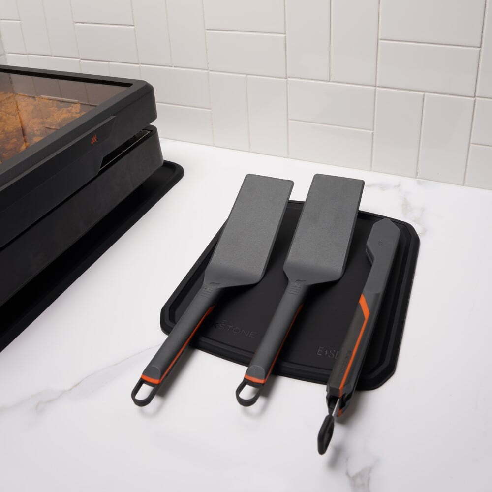 Keep your cooking area clean and organized with this Blackstone E-Series Griddle Accessories Mat. This heat-resistant mat is great for resting your spatula, spoon, or tongs on while you are cooking on your E-Series griddle. Whether you tend to make a mess on your counter when you place your cooking utensils there or just want a non-slip place to set things so they are within arm’s reach, this mat is for you. E-Series griddle utensils and tools fit perfectly within the dimensions of the mat so you don’t have to put any part of your utensils on the table. This mat is made of silicone and is dishwasher-safe for easy cleaning. Make cleanup a breeze when you use this E-Series Griddle Accessories Mat. Blackstone E-Series 11" x 12.5" Black Silicone Mat for Griddle Accessories 100% silicone construction Dimensions: 11" W x 12.5" L Heat-resistant to withstand hot cooking utensils Raised edge to contain any grease or food debris from cooking utensils Place cooking utensils on mat to avoid messes on your table or countertop Specially designed for use with Blackstone E-series cooking utensils Dishwasher-safe for easy cleanup