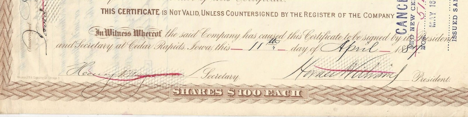 Iowa Falls & Sioux City Railroad Company Cedar Rapids, Iowa Capital Stock Certificate for 100 shares, #4871, Dated 1871 In BROWN Issued to Stuyvesant Fish, Trustee and signed on back ** NOTEWORTHY ** PRINTER: Western B. N. Engraving Co. Chicago Information image copies are included with certificate Images: POSTAGE U.S. Sent First Class with tracking, starting @ $6.00 US Canada Sent First Class Canada with no tracking, starting @ $6.00 US NON U.S, case by case, starting @ $8.00 US, sent First Class. I do ship world wide. -- All the certificates and all other items I sell are sold as collectibles only; although they are authentic, they no longer hold financial value. I do have other items up for auction. I Do Combine