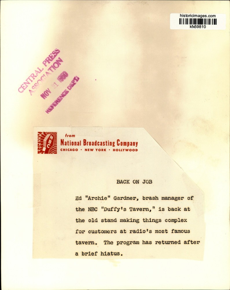 ebay template Note: Please study the images carefully to determine the condition of this vintage photograph, as it may not be in perfect condition. It may contain wrinkles, cracks, and possibly even tears due to its age and how it was handled before it got to us. A scanner may interpret colors and contrast differently than human eyes will, so it is possible that the actual photograph may be slightly darker or lighter in person. This vintage photograph is offered for sale as a collectible item and conveys no transfer of copyright. 1950 Press Photo Ed "Archie" Gardner stars in NBC's "Duffy's Tavern" - kfx59810 Ed "Archie" Gardner, brash manager of the NBC "Duffy's Tavern," is back at the old stand making things complex for customers at radio's most famous tavern. The program has returned after a brief hiatus. Photo measures 7.25 x 9 inches. Photo Is dated 1950. PHOTO FRONT PHOTO BACK Historic Images Part Number: kfx59810 Sell Smarter with Kyozou. Inventory and Ecommerce Management