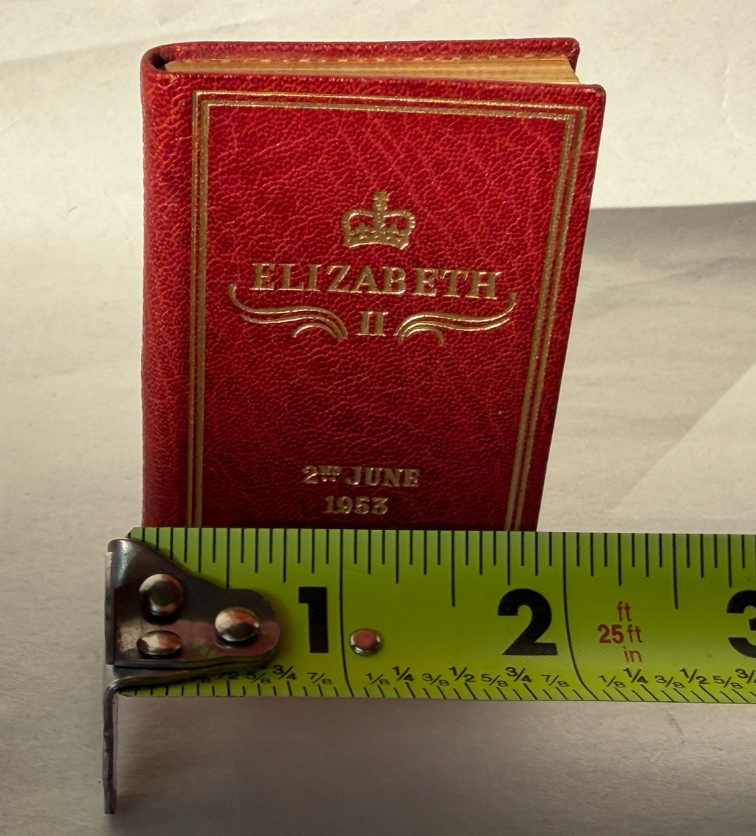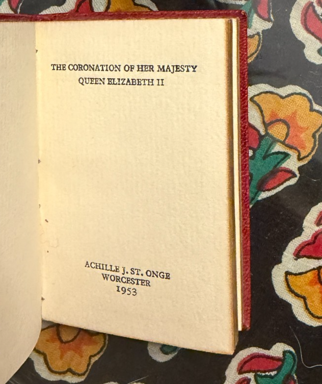Miniature commemorative book issued for the Coronation of Her Majesty Queen Elizabeth II , dated 2nd June 1953 . Published by Achille J. St. Onge, Worcester, Massachusetts , a noted American miniature-book publisher. Contains the order of service for the coronation ceremony. A well-made collectible produced specifically for miniature-book collectors and royal memorabilia enthusiasts. A scarce and charming piece of Elizabeth II coronation ephemera and a desirable example of mid-century American miniature bookmaking. Details: Format: Miniature book (portrait orientation) Size: approx. 2.75β³ x 1.75β³ Binding: Gilt-lettered red leather with all-edge gilt (AEG) Pages: 77 pages, printed in black and red Edition: Limited to 2,000 copies Year: 1953 Condition: Covers show slight darkening and age-appropriate wear; pages toned with age. Structurally sound and complete. See photos for exact condition. π¬ Shipping: Securely packed for miniature books and shipped via USPS Ground Advantage . Combined shipping available. π Thanks for visiting! Explore my shop for estate-found miniature books and historical ephemera. π