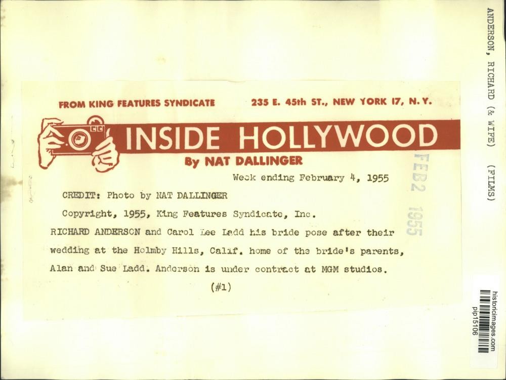 ebay template Note: Please study the images carefully to determine the condition of this vintage photograph, as it may not be in perfect condition. It may contain wrinkles, cracks, and possibly even tears due to its age and how it was handled before it got to us. A scanner may interpret colors and contrast differently than human eyes will, so it is possible that the actual photograph may be slightly darker or lighter in person. This vintage photograph is offered for sale as a collectible item and conveys no transfer of copyright. 1955 Press Photo Richard Anderson & bride Carol Lee Ladd after their CA wedding This is an original press photo. Anderson, Richard (& wife) (Films). Richard Anderson and Carol Lee Ladd his bride pose after their wedding at the Holmby Hills, California, home of the bride's parents. Alan and Sue Ladd. Anderson is under contract at Metro-Goldwyn-Mayer studios.Photo measures 7 x 9.25inches. Photo is dated 2-2-1955. PHOTO FRONT PHOTO BACK Historic Images Part Number: pip15106 FAQs Q: Can I just download a digital version instead? A: No, we sell only vintage originals and do not make or distribute any copies, including digital ones. Q: Do you combine shipping and invoices? A: Multiple photos won on the same seller ID combine automatically through the eBay checkout process. If you encounter problems with this, send us a message via eBay messaging and we will send you an invoice. Due to eBay limitations, we cannot combine items won on our different seller IDs for a single shipping charge. Q: How quickly do you ship the items once paid? A: We ship within one business day after your payment clears. If you do not receive an "order shipped" email from us by the close of the second business day from submitting payment, please e-mail us via eBay messaging. Q: How do you make sure my photograph arrives safely? A: We package each order between two cross-corrugated pieces of cardboard to ensure that the package is as difficult to bend as possible. We then wrap each order in a plastic sheet to help protect against moisture. We want you to rest assured that we take every precaution to ensure that the photograph you receive will be in the same condition in your care as it was in ours. Q: Will the "Historic Images" watermark be on my photo when I receive it? A: No. This is a digital watermark we use to protect our images. It is not printed on the photo. Q: What are your office hours? A: eBay for us is a business, and a very fun one to be in! We are open M-F 9 to 5 (CST). Therefore, we do not return e-mails and phone calls over the weekend. We observe the following holidays: New Years Day, Memorial Day, Fourth of July, Labor Day, Thanksgiving and the day after Thanksgiving, Christmas Eve and Christmas Day. Q: Where did all these vintage photos come from? A: These original vintage photographs are from various news service and newspaper photo archives from locations around the country including: Boston, Detroit, Tampa, Chicago, Denver, Seattle, New Orleans, Milwaukee, Portland, Spokane, and more. We do not copy or reproduce any photographs -- every item is a unique vintage piece that was housed in a news archive. Q: Can I use this photograph in my book/blog/website? A: The short answer is no. There is no transfer of copyright for republication or reproduction with these photographs when you purchase them, and only photographs taken before 1923 are currently automatically in the public domain. Permission from the copyright holder, which usually can be identified from the back of each photo, must be sought to republish or reproduce the image for any purpose. Q: Do you relist items (in case I miss an auction ending)? A: Auction items that receive no bids are relisted in our store (historicimages-store on eBay) as a fixed-price item and at a higher price than the starting auction price. Q: Do you leave feedback? A: Yes, we always leave feedback for buyers. Our software monitors when our buyers leave us feedback, then notifies us that we can leave feedback for the buyer. Rest assured, if you leave feedback, we will do the same! Check out our family of eBay IDs: historicimages01 Sports Photos historicimages02 Entertainment Photos historicimages03 Americana Photos historicimages04 International & War Photos historicimages05 Transportation Photos historicimages06 Photos of All Subjects historicimages07 Entertainment Photos historicimages08 Newsworthy Photos historicimages09 Entertainment Photos historicimages10 Sports Photos historicimages-store Our largest fixed-price selection historicimages-gallery Hand-picked photos Saturday night auctions About Us Historic Images was formed in September 2009, with a handful of scanners working out of a basement to digitize newspaper photo archives. We have since moved out of the basement, and we can now archive thousands of photos per day. Our company has worked with magazines and newspapers from Detroit, Boston, Denver, Seattle, Tampa, Chicago, and New Orleans, just to name a few. We are constantly adding to our inventory, and have assembled an archive of millions of photos to date. As our company evolved, we began our eBay business, which brings thousands of fresh auctions per week to the world's largest online auction marketplace. Our custom software systems and team of great employees allow us to efficiently scan and sell large photo archives online. At the very core of our company's DNA is a strong commitment to customer satisfaction and strict integrity for our product. Our promise to you is that we will do everything in our power to provide you a great buying experience. Copyright 2009 - Present, Historic Images, Inc. Sell Smarter with Kyozou. Inventory and Ecommerce Management