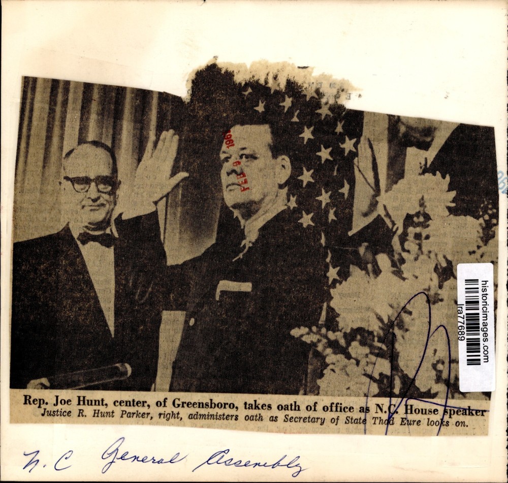 ebay template Note: Please study the images carefully to determine the condition of this vintage photograph, as it may not be in perfect condition. It may contain wrinkles, cracks, and possibly even tears due to its age and how it was handled before it got to us. A scanner may interpret colors and contrast differently than human eyes will, so it is possible that the actual photograph may be slightly darker or lighter in person. This vintage photograph is offered for sale as a collectible item and conveys no transfer of copyright. 1961 Press Photo North Carolina Assemblyman Joe Hunt, R. Hunt Parker & Thad Eure This is an original press photo. Rep. Joe Hunt, center, of Greensboro, takes oath of office as North Carolina House Speaker. Justice R. Hunt Parker, right, administers oath as Secretary of State Thad Eure looks on. North Carolina General AssemblyPhoto measures 7 x 6.75inches. Photo is dated 02-09-1961. PHOTO FRONT PHOTO BACK Historic Images Part Number: lra77689 FAQs Q: Can I just download a digital version instead? A: No, we sell only vintage originals and do not make or distribute any copies, including digital ones. Q: Do you combine shipping and invoices? A: Multiple photos won on the same seller ID combine automatically through the eBay checkout process. If you encounter problems with this, send us a message via eBay messaging and we will send you an invoice. Due to eBay limitations, we cannot combine items won on our different seller IDs for a single shipping charge. Q: How quickly do you ship the items once paid? A: We ship within one business day after your payment clears. If you do not receive an "order shipped" email from us by the close of the second business day from submitting payment, please e-mail us via eBay messaging. Q: How do you make sure my photograph arrives safely? A: We package each order between two cross-corrugated pieces of cardboard to ensure that the package is as difficult to bend as possible. We then wrap each order in a plastic sheet to help protect against moisture. We want you to rest assured that we take every precaution to ensure that the photograph you receive will be in the same condition in your care as it was in ours. Q: Will the "Historic Images" watermark be on my photo when I receive it? A: No. This is a digital watermark we use to protect our images. It is not printed on the photo. Q: What are your office hours? A: eBay for us is a business, and a very fun one to be in! We are open M-F 9 to 5 (CST). Therefore, we do not return e-mails and phone calls over the weekend. We observe the following holidays: New Years Day, Memorial Day, Fourth of July, Labor Day, Thanksgiving and the day after Thanksgiving, Christmas Eve and Christmas Day. Q: Where did all these vintage photos come from? A: These original vintage photographs are from various news service and newspaper photo archives from locations around the country including: Boston, Detroit, Tampa, Chicago, Denver, Seattle, New Orleans, Milwaukee, Portland, Spokane, and more. We do not copy or reproduce any photographs -- every item is a unique vintage piece that was housed in a news archive. Q: Can I use this photograph in my book/blog/website? A: The short answer is no. There is no transfer of copyright for republication or reproduction with these photographs when you purchase them, and only photographs taken before 1923 are currently automatically in the public domain. Permission from the copyright holder, which usually can be identified from the back of each photo, must be sought to republish or reproduce the image for any purpose. Q: Do you relist items (in case I miss an auction ending)? A: Auction items that receive no bids are relisted in our store (historicimages-store on eBay) as a fixed-price item and at a higher price than the starting auction price. Q: Do you leave feedback? A: Yes, we always leave feedback for buyers. Our software monitors when our buyers leave us feedback, then notifies us that we can leave feedback for the buyer. Rest assured, if you leave feedback, we will do the same! Check out our family of eBay IDs: historicimages01 Sports Photos historicimages02 Entertainment Photos historicimages03 Americana Photos historicimages04 International & War Photos historicimages05 Transportation Photos historicimages06 Photos of All Subjects historicimages07 Entertainment Photos historicimages08 Newsworthy Photos historicimages09 Entertainment Photos historicimages10 Sports Photos historicimages-store Our largest fixed-price selection historicimages-gallery Hand-picked photos Saturday night auctions About Us Historic Images was formed in September 2009, with a handful of scanners working out of a basement to digitize newspaper photo archives. We have since moved out of the basement, and we can now archive thousands of photos per day. Our company has worked with magazines and newspapers from Detroit, Boston, Denver, Seattle, Tampa, Chicago, and New Orleans, just to name a few. We are constantly adding to our inventory, and have assembled an archive of millions of photos to date. As our company evolved, we began our eBay business, which brings thousands of fresh auctions per week to the world's largest online auction marketplace. Our custom software systems and team of great employees allow us to efficiently scan and sell large photo archives online. At the very core of our company's DNA is a strong commitment to customer satisfaction and strict integrity for our product. Our promise to you is that we will do everything in our power to provide you a great buying experience. Copyright 2009 - Present, Historic Images, Inc. Sell Smarter with Kyozou. Inventory and Ecommerce Management