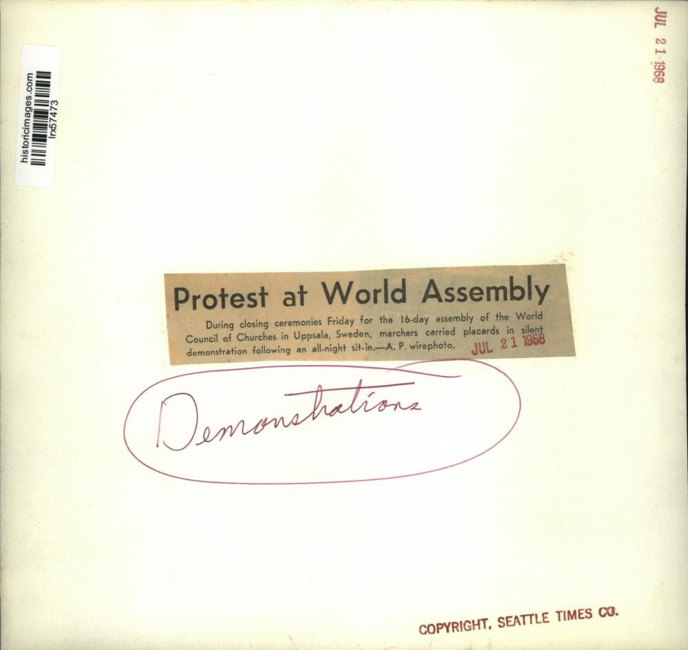 ebay template Note: Please study the images carefully to determine the condition of this vintage photograph, as it may not be in perfect condition. It may contain wrinkles, cracks, and possibly even tears due to its age and how it was handled before it got to us. A scanner may interpret colors and contrast differently than human eyes will, so it is possible that the actual photograph may be slightly darker or lighter in person. This vintage photograph is offered for sale as a collectible item and conveys no transfer of copyright. 1968 Press Photo Protest At World Council Of Churches In Uppsala, Sweden This is an original press photo. Protest at World Assembly During closing ceremonies Friday for the 16 day assembly of the World Council of Churches in Uppsala, Sweden, marchers carried placards in silent demonstration following an all night sit in. Photo measures 8.75 x 8.25 inches. Photo is dated 07-21-1968. PHOTO FRONT PHOTO BACK Historic Images Part Number: lrx57473 FAQs Q: Can I just download a digital version instead? A: No, we sell only vintage originals and do not make or distribute any copies, including digital ones. Q: Do you combine shipping and invoices? A: Multiple photos won on the same seller ID combine automatically through the eBay checkout process. If you encounter problems with this, send us a message via eBay messaging and we will send you an invoice. Due to eBay limitations, we cannot combine items won on our different seller IDs for a single shipping charge. Q: How quickly do you ship the items once paid? A: We ship within one business day after your payment clears. If you do not receive an "order shipped" email from us by the close of the second business day from submitting payment, please e-mail us via eBay messaging. Q: How do you make sure my photograph arrives safely? A: We package each order between two cross-corrugated pieces of cardboard to ensure that the package is as difficult to bend as possible. We then wrap each order in a plastic sheet to help protect against moisture. We want you to rest assured that we take every precaution to ensure that the photograph you receive will be in the same condition in your care as it was in ours. Q: Will the "Historic Images" watermark be on my photo when I receive it? A: No. This is a digital watermark we use to protect our images. It is not printed on the photo. Q: What are your office hours? A: eBay for us is a business, and a very fun one to be in! We are open M-F 9 to 5 (CST). Therefore, we do not return e-mails and phone calls over the weekend. We observe the following holidays: New Years Day, Memorial Day, Fourth of July, Labor Day, Thanksgiving and the day after Thanksgiving, Christmas Eve and Christmas Day. Q: Where did all these vintage photos come from? A: These original vintage photographs are from various news service and newspaper photo archives from locations around the country including: Boston, Detroit, Tampa, Chicago, Denver, Seattle, New Orleans, Milwaukee, Portland, Spokane, and more. We do not copy or reproduce any photographs -- every item is a unique vintage piece that was housed in a news archive. Q: Can I use this photograph in my book/blog/website? A: The short answer is no. There is no transfer of copyright for republication or reproduction with these photographs when you purchase them, and only photographs taken before 1923 are currently automatically in the public domain. Permission from the copyright holder, which usually can be identified from the back of each photo, must be sought to republish or reproduce the image for any purpose. Q: Do you relist items (in case I miss an auction ending)? A: Auction items that receive no bids are relisted in our store (historicimages-store on eBay) as a fixed-price item and at a higher price than the starting auction price. Q: Do you leave feedback? A: Yes, we always leave feedback for buyers. Our software monitors when our buyers leave us feedback, then notifies us that we can leave feedback for the buyer. Rest assured, if you leave feedback, we will do the same! Check out our family of eBay IDs: historicimages01 Sports Photos historicimages02 Entertainment Photos historicimages03 Americana Photos historicimages04 International & War Photos historicimages05 Transportation Photos historicimages06 Photos of All Subjects historicimages07 Entertainment Photos historicimages08 Newsworthy Photos historicimages09 Entertainment Photos historicimages10 Sports Photos historicimages-store Our largest fixed-price selection historicimages-gallery Hand-picked photos Saturday night auctions About Us Historic Images was formed in September 2009, with a handful of scanners working out of a basement to digitize newspaper photo archives. We have since moved out of the basement, and we can now archive thousands of photos per day. Our company has worked with magazines and newspapers from Detroit, Boston, Denver, Seattle, Tampa, Chicago, and New Orleans, just to name a few. We are constantly adding to our inventory, and have assembled an archive of millions of photos to date. As our company evolved, we began our eBay business, which brings thousands of fresh auctions per week to the world's largest online auction marketplace. Our custom software systems and team of great employees allow us to efficiently scan and sell large photo archives online. At the very core of our company's DNA is a strong commitment to customer satisfaction and strict integrity for our product. Our promise to you is that we will do everything in our power to provide you a great buying experience. Copyright 2009 - Present, Historic Images, Inc. Sell Smarter with Kyozou. Inventory and Ecommerce Management