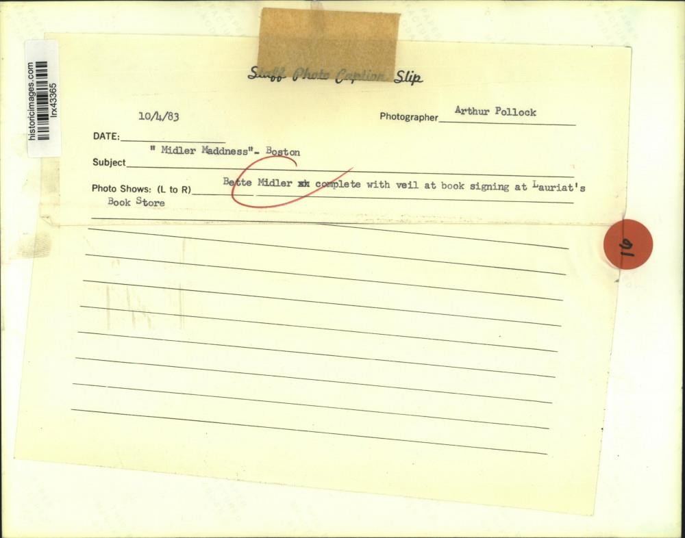 ebay template Note: Please study the images carefully to determine the condition of this vintage photograph, as it may not be in perfect condition. It may contain wrinkles, cracks, and possibly even tears due to its age and how it was handled before it got to us. A scanner may interpret colors and contrast differently than human eyes will, so it is possible that the actual photograph may be slightly darker or lighter in person. This vintage photograph is offered for sale as a collectible item and conveys no transfer of copyright. 1983 Press Photo Boston-Actress Bette Midler during Book Signing - lrx43365 This is an original press photo. Boston-Bette Midler complete with veil at book signing at Lauriat's Book Store. Photo measures 8 x 10.25 inches. Photo is dated 10-4-1983. PHOTO FRONT PHOTO BACK Historic Images Part Number: lrx43365 Sell Smarter with Kyozou. Inventory and Ecommerce Management