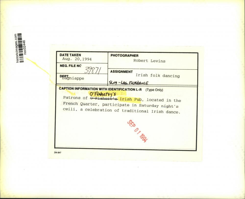 ebay template Note: Please study the images carefully to determine the condition of this vintage photograph, as it may not be in perfect condition. It may contain wrinkles, cracks, and possibly even tears due to its age and how it was handled before it got to us. A scanner may interpret colors and contrast differently than human eyes will, so it is possible that the actual photograph may be slightly darker or lighter in person. This vintage photograph is offered for sale as a collectible item and conveys no transfer of copyright. 1994 Press Photo Patrons of O'Flaherty's Irish Pub participate in an Irish Dance This is an original press photo. Patrons of O'Flaherty's Irish Pub. located in the French Quarter, participate in Saturday night's ceili, a celebration of traditional Irish dance. Photo measures 10 x 8inches. Photo is dated 08-20-1994. PHOTO FRONT PHOTO BACK Historic Images Part Number: noc02446 FAQs Q: Can I just download a digital version instead? A: No, we sell only vintage originals and do not make or distribute any copies, including digital ones. Q: Do you combine shipping and invoices? A: Multiple photos won on the same seller ID combine automatically through the eBay checkout process. If you encounter problems with this, send us a message via eBay messaging and we will send you an invoice. Due to eBay limitations, we cannot combine items won on our different seller IDs for a single shipping charge. Q: How quickly do you ship the items once paid? A: We ship within one business day after your payment clears. If you do not receive an "order shipped" email from us by the close of the second business day from submitting payment, please e-mail us via eBay messaging. Q: How do you make sure my photograph arrives safely? A: We package each order between two cross-corrugated pieces of cardboard to ensure that the package is as difficult to bend as possible. We then wrap each order in a plastic sheet to help protect against moisture. We want you to rest assured that we take every precaution to ensure that the photograph you receive will be in the same condition in your care as it was in ours. Q: Will the "Historic Images" watermark be on my photo when I receive it? A: No. This is a digital watermark we use to protect our images. It is not printed on the photo. Q: What are your office hours? A: eBay for us is a business, and a very fun one to be in! We are open M-F 9 to 5 (CST). Therefore, we do not return e-mails and phone calls over the weekend. We observe the following holidays: New Years Day, Memorial Day, Fourth of July, Labor Day, Thanksgiving and the day after Thanksgiving, Christmas Eve and Christmas Day. Q: Where did all these vintage photos come from? A: These original vintage photographs are from various news service and newspaper photo archives from locations around the country including: Boston, Detroit, Tampa, Chicago, Denver, Seattle, New Orleans, Milwaukee, Portland, Spokane, and more. We do not copy or reproduce any photographs -- every item is a unique vintage piece that was housed in a news archive. Q: Can I use this photograph in my book/blog/website? A: The short answer is no. There is no transfer of copyright for republication or reproduction with these photographs when you purchase them, and only photographs taken before 1923 are currently automatically in the public domain. Permission from the copyright holder, which usually can be identified from the back of each photo, must be sought to republish or reproduce the image for any purpose. Q: Do you relist items (in case I miss an auction ending)? A: Auction items that receive no bids are relisted in our store (historicimages-store on eBay) as a fixed-price item and at a higher price than the starting auction price. Q: Do you leave feedback? A: Yes, we always leave feedback for buyers. Our software monitors when our buyers leave us feedback, then notifies us that we can leave feedback for the buyer. Rest assured, if you leave feedback, we will do the same! Check out our family of eBay IDs: historicimages01 Sports Photos historicimages02 Entertainment Photos historicimages03 Americana Photos historicimages04 International & War Photos historicimages05 Transportation Photos historicimages06 Photos of All Subjects historicimages07 Entertainment Photos historicimages08 Newsworthy Photos historicimages09 Entertainment Photos historicimages10 Sports Photos historicimages-store Our largest fixed-price selection historicimages-gallery Hand-picked photos Saturday night auctions About Us Historic Images was formed in September 2009, with a handful of scanners working out of a basement to digitize newspaper photo archives. We have since moved out of the basement, and we can now archive thousands of photos per day. Our company has worked with magazines and newspapers from Detroit, Boston, Denver, Seattle, Tampa, Chicago, and New Orleans, just to name a few. We are constantly adding to our inventory, and have assembled an archive of millions of photos to date. As our company evolved, we began our eBay business, which brings thousands of fresh auctions per week to the world's largest online auction marketplace. Our custom software systems and team of great employees allow us to efficiently scan and sell large photo archives online. At the very core of our company's DNA is a strong commitment to customer satisfaction and strict integrity for our product. Our promise to you is that we will do everything in our power to provide you a great buying experience. Copyright 2009 - Present, Historic Images, Inc. Sell Smarter with Kyozou. Inventory and Ecommerce Management
