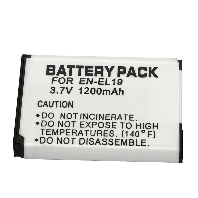 Product Description: Battery Capacity: 1200mAh Battery Voltage: 3.7V Battery Model: EN-EL19 Battery Type: Li-ion Compatible Camera Models: For Nikon Coolpix W150 W100 Coolpix S100 Coolpix S2500 S2600 S2700 S2750 S2800 Coolpix S32 S33 S3100 S3200 S3300 S3400 S3500 S3600 S3700 Coolpix S4100 S4150 S4200 S4300 S4400 Coolpix S5200 S5300 Coolpix S6400 S6500 S6600 S6700 S6800 S6900 Coolpix S7000 Sony NP-BJ1 DSC-RX0 Feature: 1. 100% Brand new and high quality. 2. product match the description. 3. High Energy Density, Extra Long Life, Memory Free. 4. High capacity / rechargeable Li-ion battery with premium cell. 5. Extra power for your digital video camera / camcorder. The duration of the shooting is not inferior to the original. 6.Overheat protection and overcharge protection.