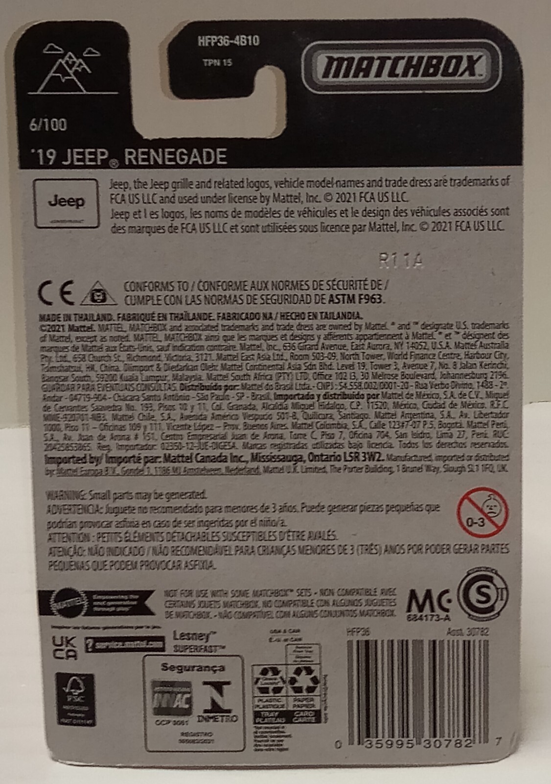 This 2022 Matchbox Basic toy vehicle features a 2019 Jeep Renegade in a striking blue color. The 1:64 scale diecast model is part of the MBX Off-Road series and comes in an unopened box. It is a perfect addition to any collection of contemporary manufactured cars, trucks, and vans. The Matchbox Basic 2019 Jeep Renegade is made in Thailand and has not been customized or autographed. It is a great gift for any SUV enthusiast and is sure to provide hours of fun and imaginative play. Get your hands on this limited edition model today!