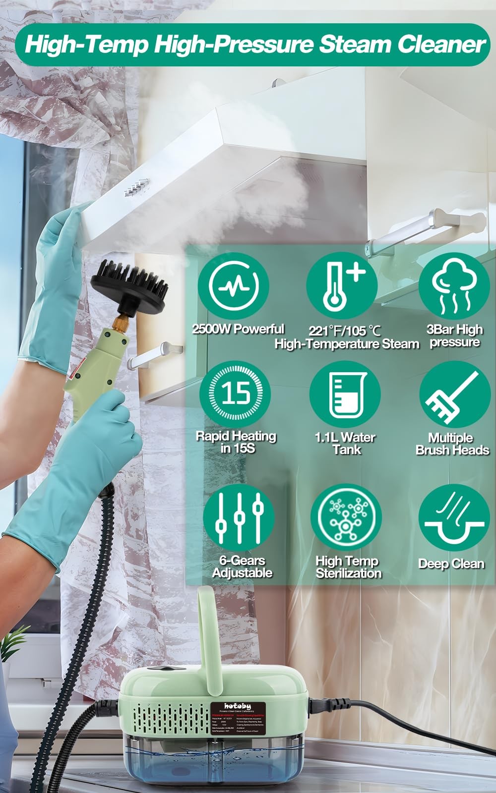 Steam Cleaner, 2500W High Pressure Handheld Steamer, 6-gear adjustable, Portable Steam Cleaning Machine with 6 Brushes, Cleaning for Home Use, Kitchen, Bathroom, , Tile, Hard Surface, Car Detailing 【High Pressure steam cleaning & Non-chemistry】Steam is nature's pure and powerful cleaner for safely cleaning hard surfaces in your home without harsh chemicals, So very environmentally friendly. The high pressure steam cleaner heats up quickly in 15 seconds, reaching 221°F/105°C and 3BAR high temperature pressured flow of steam with 2500W high power. It can remove stubborn dirt and grease on a variety of surfaces effectively that make daily cleaning easy and create a clean and comfortable home. 【Large capacity tank】Small tanks that need to be filled frequently are troublesome. But this steam cleaner is equipped with a 1100ml large capacity tank which can be used continuously, no need to add water frequently, improving your cleaning work efficiency. You can focus on cleaning even if you're far from water and it is also useful for cleaning a wide area and cleaning all at once. 【Easy to use& Portable】The steam cleaner is equipped with a user-friendly touch screen. 1-6 gears are clear at a glance. You can adjust the steam output volume easily with one touch to meet your different daily cleaning needs. With a compact design, the steamer only weighs about 3.1lb, easy to carry to any place you want to clean. Comes with 2m steam pipe and 1.5m extra-long power cord that you can reach far away and don't need to carry the water tank all the time. 【A wealth of accessories】 You'll get 6 brush heads in 3 different varieties - steel brush, plastic brush and big plastic brush that you can choose different brushes according to the cleaning object. Also, the handheld steamer comes with a 2m steam pipe and extension tube, which can deeply clean the hard-to-reach areas like crevices and corners and tight spaces saving your labor. And the protective gloves have been prepared. To avoid accidental burns, please wear gloves to work. 【Widely used in various scene】This High Pressure Steam Cleaner is the perfect tool for deep cleaning your home. It can be used not only for cleaning kitchens, walls, stoves, oil fumes, microwave ovens, washing machines, refrigerators, cars and carpets, but also for bathrooms, furniture, cars and so on. Within the warranty period, if there are any issues with the product or if you have any feedback, please contact us directly (Our contact information is in the instruction). We will respond carefully until you are satisfied. 【Kindly Reminder】1. To avoid burned, please wear gloves and ensure that the waterproof washer is properly installed to avoid air and water leaks. 2. Every steam cleaner is tested before leaving the factory, so there will be water marks on the water inlet hose. 3. There is no control unit on the spray gun. If you want to stop steaming, please turn off the switch power of the machine's body. 4. Please do not touch the metal nozzle, do not touch the steam, do not spray at humans, pets or the device itself.