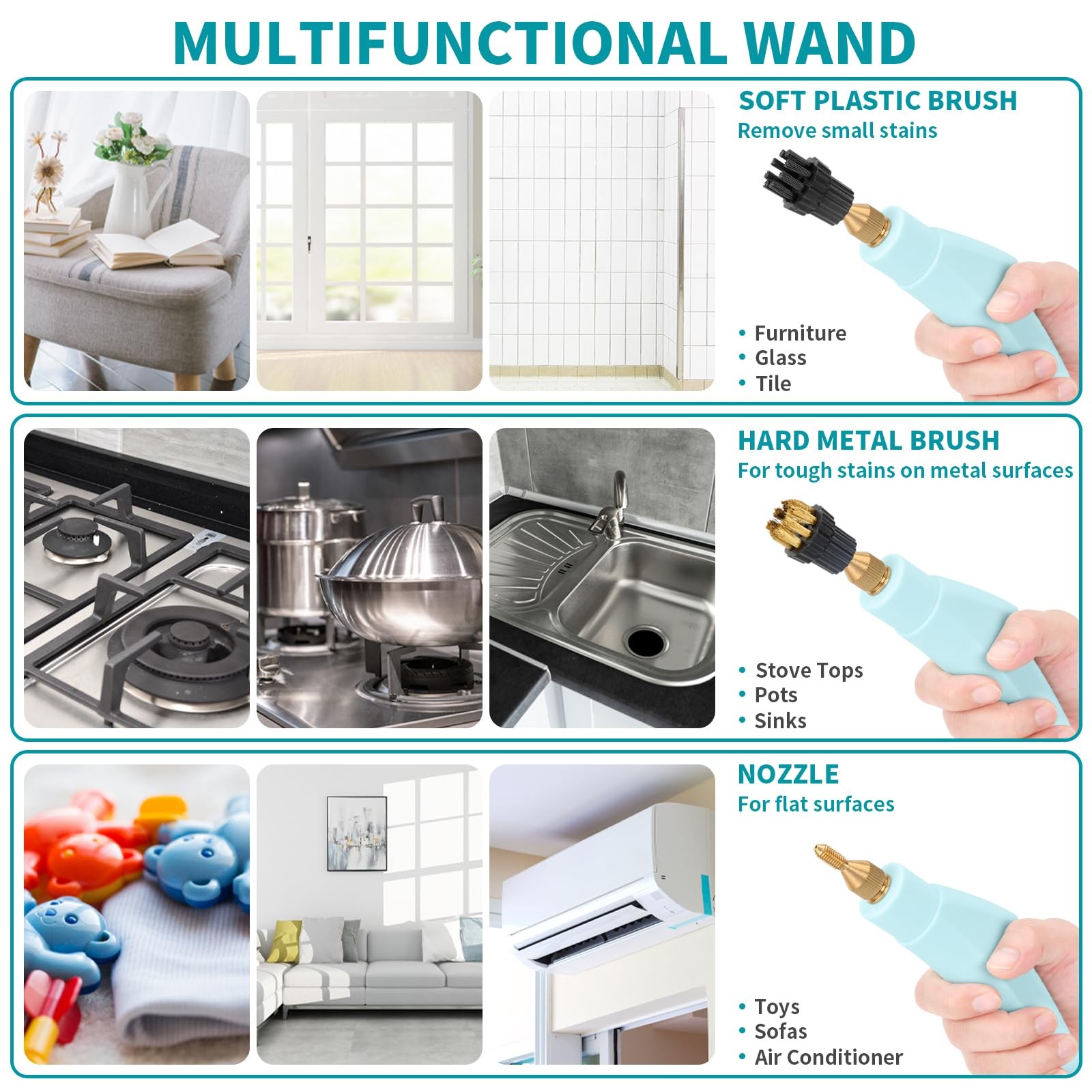 Powerful Steam Cleaner-This high-pressure cleaner has a maximum power of 2500W, 15 seconds of rapid heating, deep cleaning to remove all kinds of grease, dust and stains on the surface, very convenient to use.1100ML large water tank can be “long standby” after adding water, which can make the cleaning rhythm is not interrupted, improve work efficiency. Powerful Steam Cleaner-This high-pressure cleaner has a maximum power of 2500W, 15 seconds of rapid heating, deep cleaning to remove all kinds of grease, dust and stains on the surface, very convenient to use.1100ML large water tank can be “long standby” after adding water, which can make the cleaning rhythm is not interrupted, improve work efficiency. Intelligent Screen Control, Easy To Switch- cancel the knob adjustment, directly upgraded to 6-level touch adjustment of the intelligent screen, the operation is extremely simple, finger touch “+” “-”, can be adjusted at any time to different gears. Gently wipe precious jewelry, or give stubborn stains “strong attack”, so that cleaning is no longer difficult, easy to accurately locate each cleaning details. Multiple Brush Head, Corner Worry-Free - steam cleaner for a variety of scenes, from the bar steel, large and small 3 kinds of brush head and long elbow nozzle, graffiti, grease stains, crevices and other dirty nowhere to hide, daily cleaning problems a key to solve the packaging, and then difficult corners, stains can be easily overcome. Extra Long Pipe - 7.2 feet power cord, 6.6 feet steam pipe, remote water extraction can also be unobstructed. The body is only 4.6 pounds, easy to use with one hand, portable and compact, easy to place in the corners of your home and on the go to help you perform your cleaning skills. Accessories Complete, Caring Guard - Each machine comes with a slim elbow nozzle, 1 large brush, 1 small brush, 1 small steel brush, 1 pair of silicone gloves, 1 towel, 2 waterproof rings, and a detailed instruction manual, which takes into account every aspect, from safety to practical operation, and gives you peace of mind and peace of mind. Safety Tips For More Peace Of Mind - Safety tips to remember: never point the steam port at people, pets and electronic products, high temperature steam is no joke; when changing parts, wait for the machine to be completely turned off and cooled down, don't touch the jet switch; check the position of the gasket before use, don't let the air and water escape, and do a good job of cleaning each time steadily and securely.