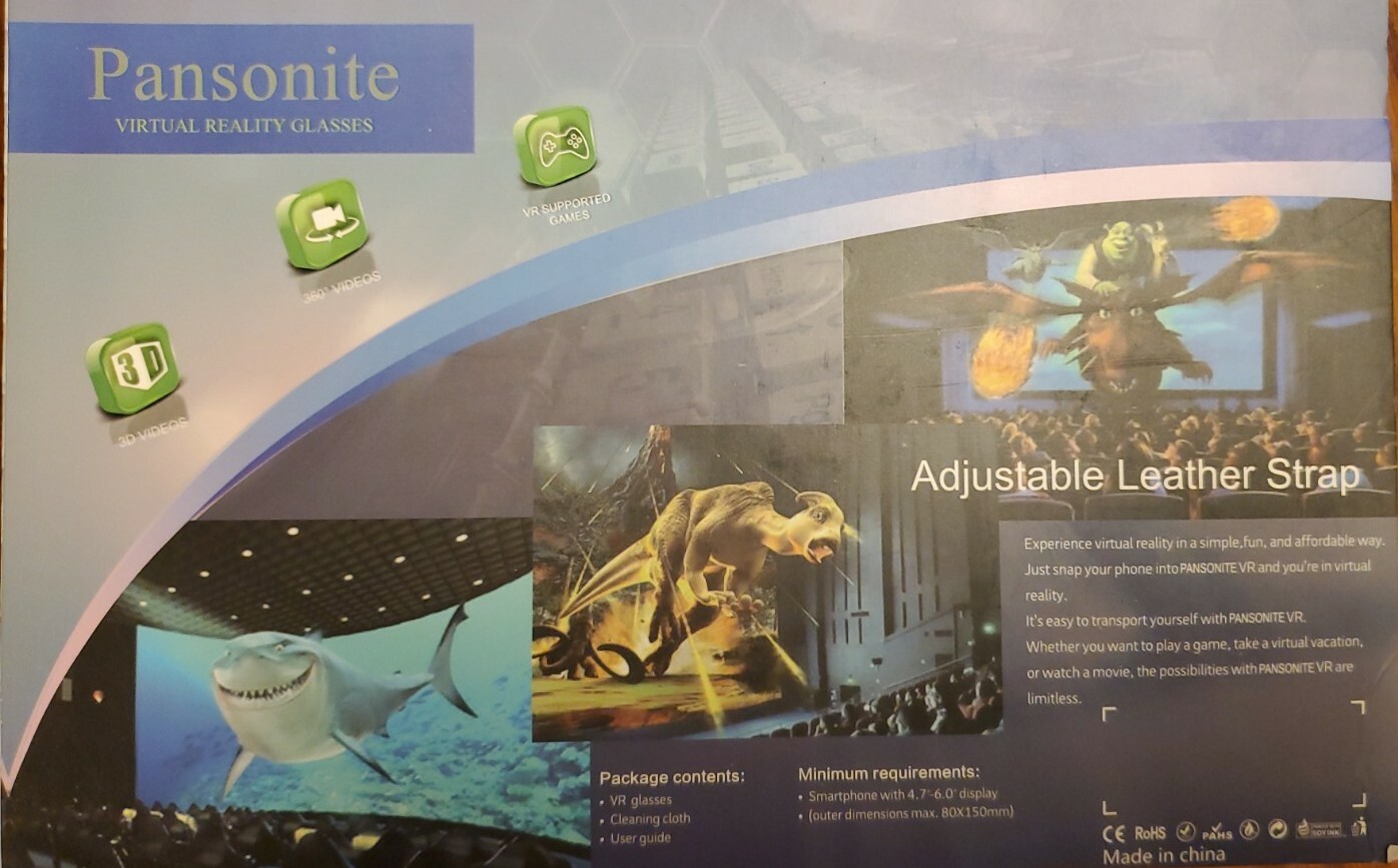 Include:1xVR-CASE,1xVR-BOX,1xremote Controller,1xUser's manual,1xClothColor:Blackgtin13:does not applyType:VR GlassesMPN:5962857278UPC:does not applyDesign:HiDef Optical Resin Lenses,3 adjustable straps,facMaterial:ABS Material Piano Paint TechnologyLens:Japan Imported a Spherical Lens DistortionBrand:PansoniteModel:3D VRFeatures:iOS and Android SmartphoneAngle:360