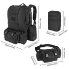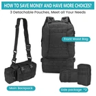 Feature 【Durable & Waterproof Material】 Military backpack is made of high density 900D Oxford fabric. Soft and breathable, resistant to scratches, wrinkles and high wear resistance. built with double-stitched seams, heavy-duty zippers, breathable mesh padded back and functional compression system for space-saving, so you don't worry break during the journey. 【Combination Detachable Backpack】 The Molle tactical backpack adopts a four-in-one design, which can be used in combination or separately. The backpack is divided into a main backpack, one front detachable tactical waist pack and two side detachable accessories pouches. 【Comfortable Ergonomic Design】 Military tactical assault rucksack with adjustable dual density ventilated mesh shoulder straps, disperse the pressure of shoulder under heavy duty, keep your rucksack pack secure and comfortable. Also designed with waist belt, easy to fix the pack onto your waist, no worries about the bag sliding down when riding a bike or climbing, which make you have a relaxed and pleasant journey. 【Large Capacity & Lightweight】 The tactical backpack main compartment 21.6" x 17.7" x 5.9", front waist pack 13.3" x 5.9" x 5.9", two side detachable accessories pouches 8.2" x 5.9"x 2.4". Weight: 3.1 lbs. The backpack can hold clothes, laptops, mobile phones, wallets, tablets, shoes, glasses, umbrellas, water cup, rope and other daily necessities. Enough to satisfy the necessary elements for hiking, camping or short trips. 【Mutil-funtion Tactical Backpack】 This tactical military pack backpack can be used as 3 day assault pack, bug out bag backpack, combat backpack, emergency backpack, army pack, range bag, hunting backpack, survival backpack, hiking camping backpack or traveling daypack etc. This assault pack is ready for any rescue or adventure for all of your gear and equipment. Specification: Color: Black/Cp/Jungle Camo/Python Black/Khaki Material: High density 900D Oxford fabric Weight (approx): 1450g Capacity: 55L Main Compartment (approx): 21.6""(55cm) high x 17.7""(45cm) wide x 5.9""(15cm) deep Front Pocket (approx): 5.9""(15cm) high x 13.3""(34cm) wide x 5.9""(15cm) deep Side Pocket (approx): 8.2""(21cm) high x 5.9""(15cm) wide x 2.4""(6cm) deep Package included: 1 x Tactical backpack (1 x main bag, 2 x side bags, 1 x front bag)