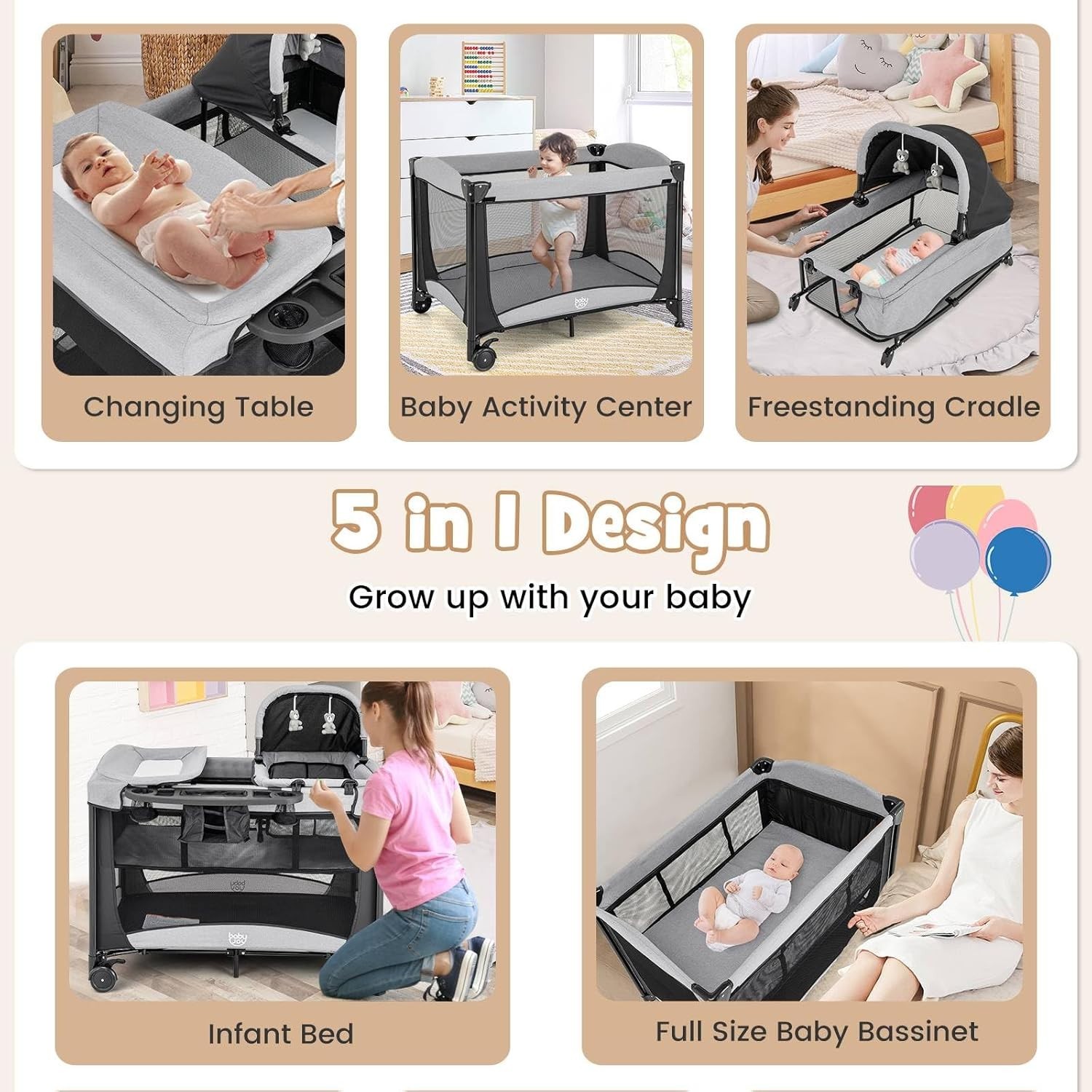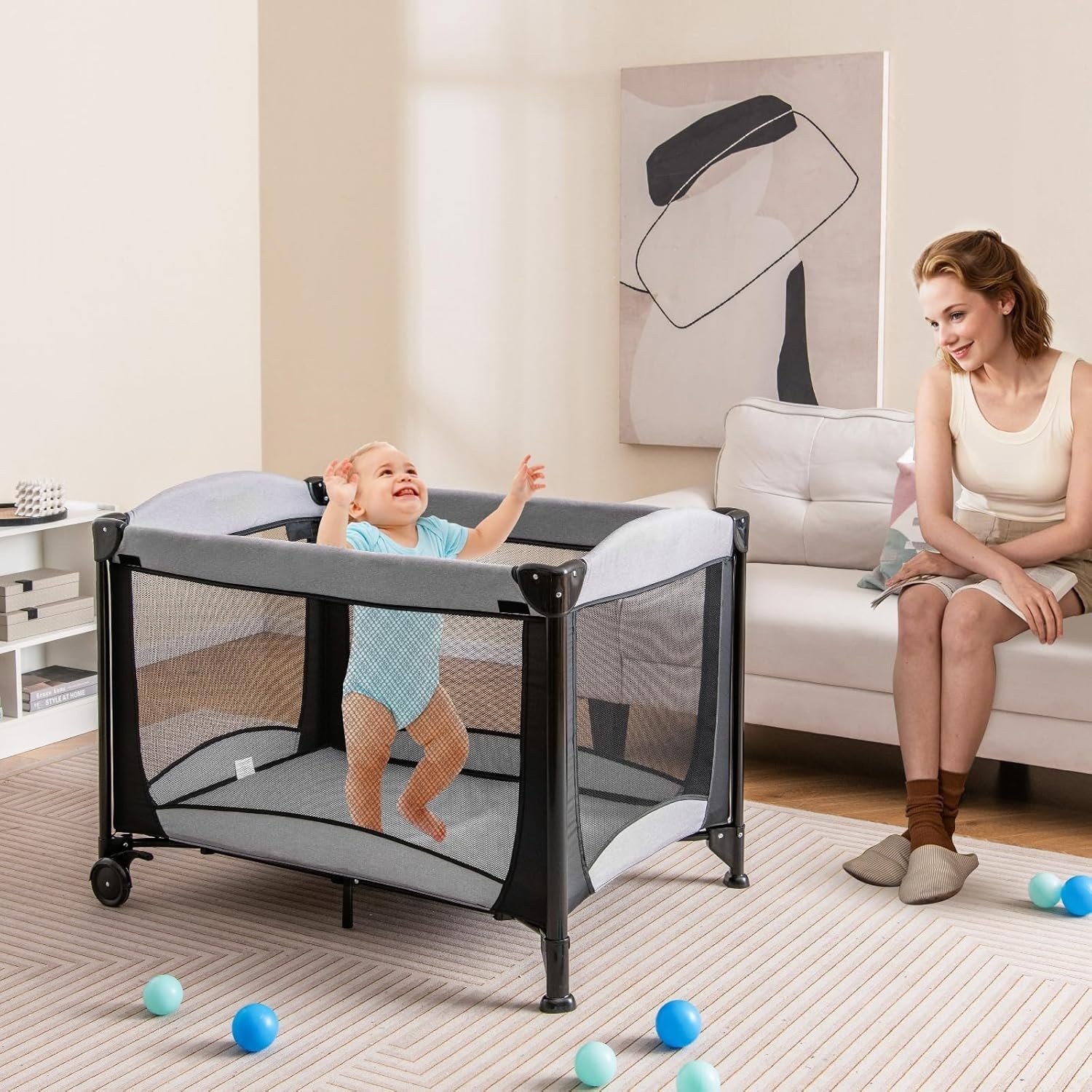 ✨ 5-in-1 Design for Growing Babies From newborn to 36 months, this versatile cot adapts as a baby bassinet, changing table, play activity center, and freestanding cradle—perfect for long-term use. ✅ Handy Changing Table & Storage Includes a removable changing station plus 3 storage pockets for nappies, bottles, toys, and baby essentials—keeping everything within easy reach. 🌟 Kid-Friendly & Safe Rounded corners, breathable mesh fabric, lockable wheels, and a sturdy 7-point iron frame design ensure maximum safety, airflow, and durability. 📦 Portable Folding Convenience Easily folds into a compact size and comes with a carry bag, making it effortless to transport for vacations, visits, or moving between rooms. 🎁 Comfortable Dimensions Spacious design with 110L x 78W x 84H cm dimensions provides a secure and roomy resting space for your baby to sleep and play. ✨ Easy Monthly Payments Pay with Klarna or PayPal Credit for flexible instalments.