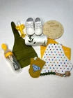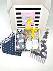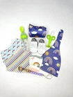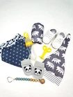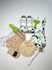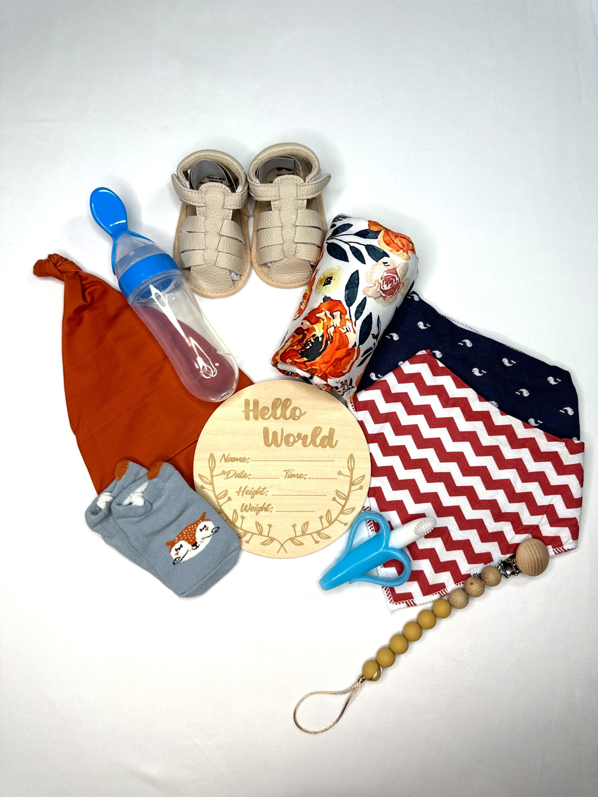 Product Description Wrap your little one in the warmth and comfort of our "Adorable Baby Swaddle and Hat Gift Set." Each set includes a beautifully coordinated swaddle and hat duo in a variety of enchanting designs, making it the perfect choice for both style and functionality. Suitable up to 4 months. Designs Available Orange Floral Swaddle with Orange Hat: A burst of vibrant florals that will brighten up your baby's day. Green Leaves Swaddle with Green Hat: Nature-inspired leaves to embrace the beauty of the outdoors. Purple Floral Swaddle with Matching Hat: A touch of elegance with delicate purple blooms. Blue Rainbow Swaddle with Blue Hat: Embrace the magic of rainbows with this cheerful set. Purple Rainbow Swaddle with Matching Hat: Let your baby dream under the rainbow with this purple swaddle and hat set. It's a magical addition to your nursery. Grey Bear Swaddle with Matching Hat: A whimsical bear design that's both cute and cuddly. Set Contents Each "Adorable Baby Swaddle and Hat Gift Set" is a complete ensemble for your baby's comfort and enjoyment. Here's what's included: Swaddle and Hat: The heart of the set, these swaddle and hat duos are made of soft and cozy polyester material, ensuring your baby stays warm and snug. Shoes: Adorable little shoes to keep those tiny toes cozy and stylish. Cute Pair of Socks: Socks with charming designs to add a dash of playfulness to every outfit. Silicone and Wood Pacifier Holder: Keep your baby's pacifier within easy reach while adding a touch of safety and style. Silicone Teething Banana: A soothing and safe teether designed to provide comfort during teething. New Tech Spoon Feeder with Secure Top: Make feeding a breeze with this innovative spoon feeder, complete with a secure top to prevent spills. "Hello World" Wood Milestone Chip: Capture and commemorate each precious moment with this wooden milestone chip that says "Hello World. Our "Adorable Baby Swaddle and Hat Gift Set" is the perfect choice for both newborns and infants. These sets not only provide comfort and warmth but also add a dash of style to your baby's daily attire. Made with the utmost care and designed for both practicality and aesthetics, they are an ideal gift for any new parent. Choose your favorite design or collect them all to keep your baby cozy and stylish all year round.