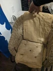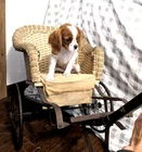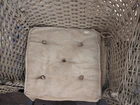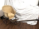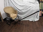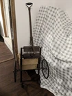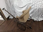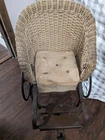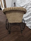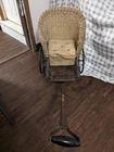 A very unique usable conversation piece. It looks like a Heywood Wakefield piece but I couldn't find the makers name. The wheels are 12 " cast. The body is wicker, the snap and loop are still attached but the seat belt is missing. The seat cushion feels like it has brittle straw in it, the back cushion shown in ninth picture has no padding and needs to be reattached. The bottom of seat and frame is wood (and metal attachments,screws) Very ornate and attractive. When you pick it up to pull out push, it sets on both front and small back wheels. When not in action, it sits on the large wheels and the decorative rest on the bottom of the carriage. It was made for a baby but it's also a wonderful display for your dolls. ****PUPPY NOT INCLUDED**** The length is about 46" (handle doesn't fold) the width is 26" and the height is 26". I will do local pick up. I can meet in the vicinity of Capital City Mall in Mechanicsburg,Pa or State St Ephrata Pa. Contact me for local pick up. Or if the shipping calculator looks too expensive, let me know your zip code and I will see what I can do!