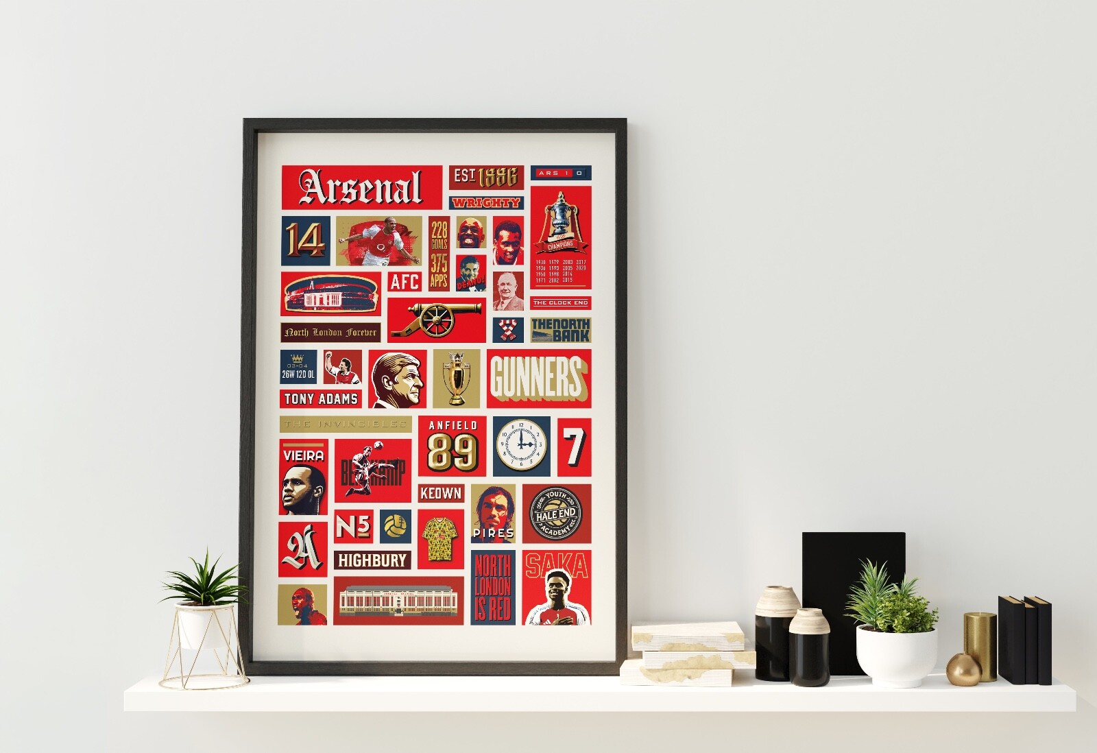 A graphical poster featuring famous characters, achievements and events in Arsenal's history. This poster print would make the perfect gift for any Arsenal supporter, whether it be your dad, your boyfriend or a best friend. It features legendary figures of the club such as Arsene Wenger, Herbert Chapman, Patrick Vieira, and record goal-scorer Thierry Henry. The print celebrates iconic moments in the past such as the The Invincibles and their old home Highbury Stadium, as well as popular Arsenal phrases such as 'The Clock End' and 'The North Bank'. This is a piece of Arsenal Wall Decor packed with important fan references. You will receive a high-quality Arsenal print on a lustre finish 260gsm fine art paper, which was carefully selected to elevate the vibrant colours featured in each design. Prints are made using professional Canon Pro printing equipment, which gives much smoother gradient transitions and a wider colour gamut. In other words, more depth and richness to the final print, which helps to create stunning vibrant artwork with amazing reproduction. A Giclée print is highly durable and will last a lifetime without any fading or bronzing. Framed Prints: Crafted from durable pine wood, the sturdy black frame is built to last and features shatterproof plexiglass to protect your print for years to come. The frames come pre-packed with corners and wrap and then packed in a box with strong edges to protect the frames. I-beams are used in addition, to give the package additional sturdiness. Postage & Packaging: A4 only prints will be delivered flat in rigid board backed envelopes. A3, A2 & A1 prints will be rolled into sturdy cardboard tubes.