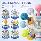 About this Item 5 IN 1 Soft Baby Toys Set - Our Montessori toy bundle for 6 months and up comes in a convenient set of 1 pull string toy, 1 newborn rattle teether, 6 soft building blocks, 6 stacking rings, and 5 textured sensory balls. Made of safe teething material, BPA-free, non-toxic, and chemical-free, ensuring the highest quality and safety for your baby. Great educational sensory toys for babies 6 to 12 months. Diverse Stacking Sensory Toy - These connecting baby building blocks, stacking rings, and textured balls are easy to pick up and stacked together for 6, 7, 8, 9, 10, 11, 12, 18 months newborn babies. They will make a squeaking sound when you squeeze the soft and interactive baby toy. Identifying numbers, animals, colors, and shapes, and have fun along the way! Travel Pull String Toy - It has a very unique airplane design with 6 colorful silicone pull cords, pop bubbles, a sliding button ball, and a built-in jingle ball. Develop baby's motor skills and sensory perception by pulling up and down silicone ropes, pressing and pushing buttons. With an easy-to-hold/storage size, the developmental activity toy is great as a traveling toy to keep the baby entertained for hours. Explore Infant Rattle Teether - Our sensory chew toys are made of non-toxic, food-grade material, allowing babies to explore safely with mouths. Featuring 12 soft rubber tips, it's perfect for 0-12 months toddlers, effectively massaging gums to relieve teething pain. The rattle makes a rustling sound when shaken, and a clicking sound when twisted. Perfect for baby's tiny hands, encouraging grasping and fine motor skills. Ideal Montessori Toy Gift for Babies - Our 6 to 12 months infant learning toys develop fine motor skills, hand-eye coordination, and cognitive ability! Your babies can stay engaged, entertained, and learning the whole way! Best travel toys for toddlers 1-3, easy to carry whether it is a plane, car, or train trip! Perfect birthday/Christmas/Thanksgiving gifts for 0-3-6-9-12 months, 1-year-old baby boys and girls. Description Product Details Product Dimensions 4.33 x 4.33 x 4.33 inches Item Weight 1.87 pounds