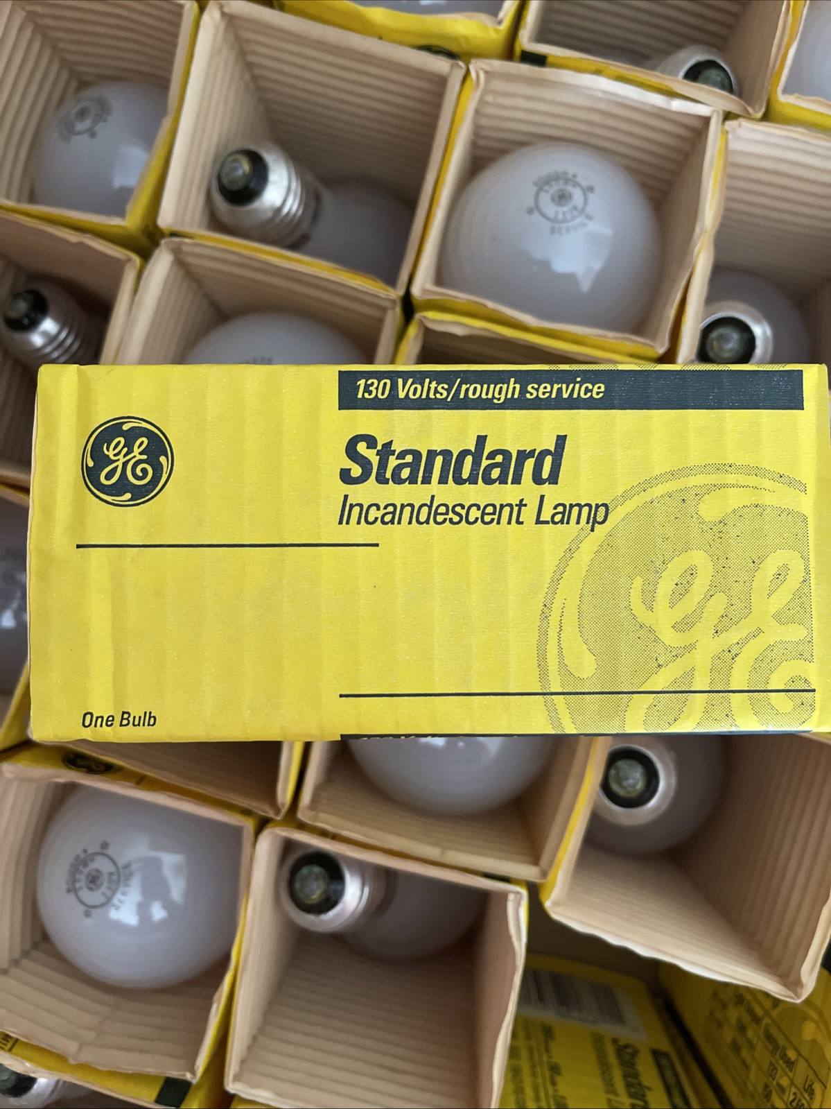 The product is a pack of 50 new vintage GE 150W rough service light bulbs, model A19, with a brightness of 2065 lumens each. The bulbs are intended for industrial or commercial use and are made in the United States. The title indicates that the price is for a pack of 50 bulbs. I’m selling these packages of 50, giving you an extra 10. This will be 60 total in the case. The reason for that is shippers are pretty tough on the filament and I’m hoping that you’ll get the 50 that you bought with no damage. If you do have damage, there’s 10 extras in there to compensate.