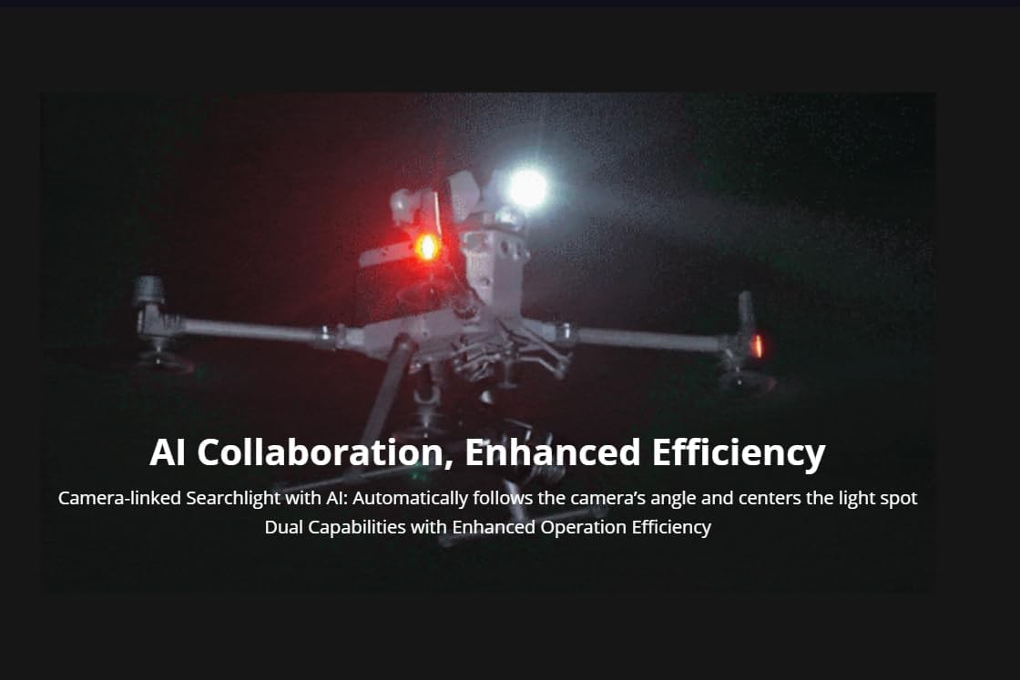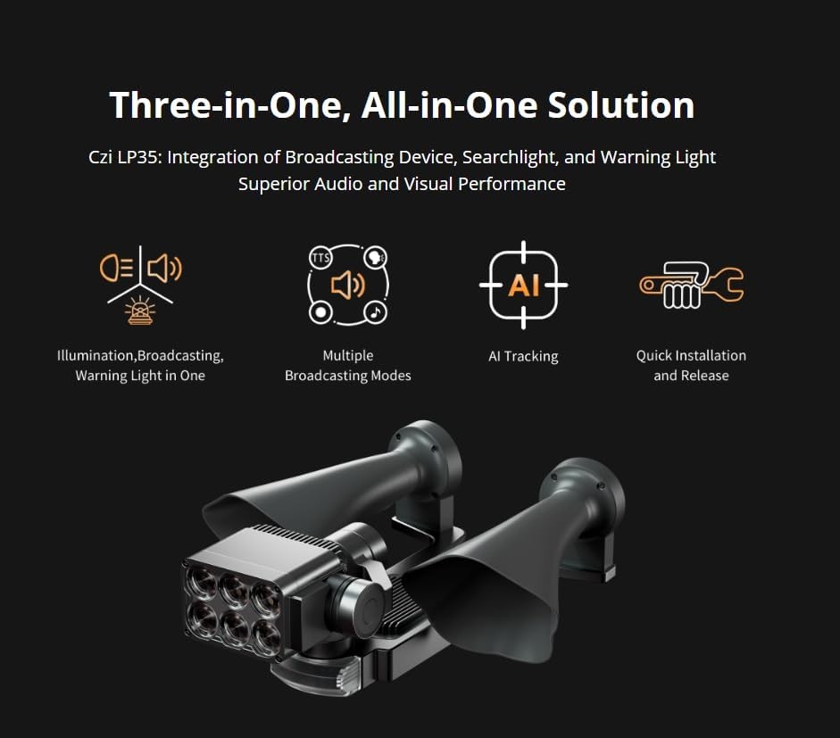 Total Power 96W Electrical Interface DJI OSDK Bluetooth Protocol Bluetooth v4.2 BR/EDR & Bluetooth Low Energy Bluetooth working frequency 2400-2483.5MHz Protection Level IP54 (TBD) The protection level is not a permanent standard and the protection capability may decrease due to product wear and tear Operating Temperature -20-+50 Degree C Warning Light Mode Red and blue flashing, red light flashing, blue light flashing Loudspeaker Sound Pressure 125dB@1m Megaphone Maximum Power/W 30 Effective broadcast distance 400m Broadcast Method Real-time shouting Recording upload Audio file playback (audio format MP3) Text-to-speech playback (supports text recording) Searchlight Light Flux/lm 6000 +/-3% Searchlight LED Power/W 60 Searchlight FOV 13 Degree Searchlight Spot Diameter 34m (Distance: 150m) 22.8m (Distance: 100m) 11.4m (Distance: 50m) Searchlight Area 917 sq. m (Distance: 150m) 407 sq. m (Distance: 100m) 102 sq. m (Distance: 50m) Central Illumination 6.3 Lux (Distance: 150m) 14.4 Lux (Distance: 100m) 57 (Distance: 50m) PTZ Control Rotation Range Pitch: -55 Degree -+65 Degree Horizontal: +/-35 Degree Roll: +/-25 Degree Searchlight Function Mode Always on mode Strobe light mode Brightness adjustment Pan/tilt angle adjustment Automatically follow the camera AI spot centering Drone Platform Support M300/M350 APP Support CZI Pilot Dimensions (L x W x H) 7.28 x 6.89 x 3.74" (185 x 175 x 95mm) Weight 19.40 oz (550g)