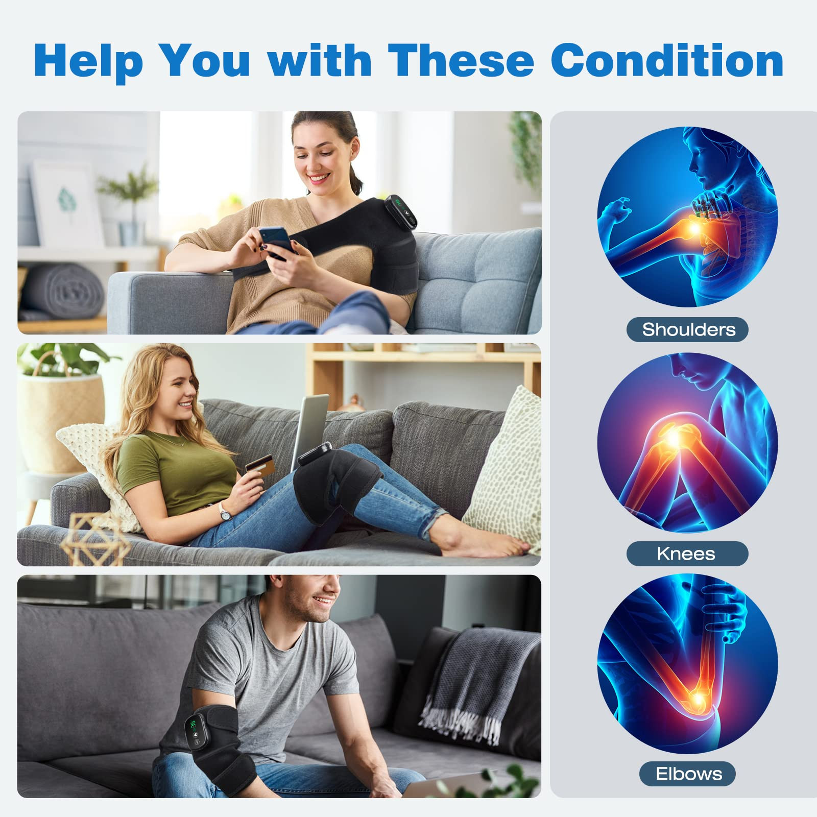 HEATING AND VIBRATION MASSAGE: The heated knee massager has 3 heating levels:113℉/122℉/140℉and 3 vibration modes, providing relax knee and injury recovery. The heating function can boosts circulation, further relieves cramps CORDLESS DESIGN: With built-in 5000mAh rechargeable battery, our knee heating pad allows you to wear it anywhere, instead of staying near the socket all the time. It's convenient to relieve discomfort when doing housework, resting, gardening, working KNEE/SHOULDER/ELBOW MASSAGER: 3 In 1 heated massager wrap pad is not only used for knees, but also for elbow and shoulder. Heated knee brace is equipped with extension straps, which means you can use it to heat your arms, thighs, knees, calves, ankles EASY OPERATION: Long press the button for 3 seconds to turn ON/OFF. Fix knee warmer at the knee/elbow/shoulder position. Choose the temperature or vibration function as needed. These two functios can be used alone or at the same time DELICATE CHOICE: Our knee massager is your choice for families, friends, teachers, beloved ones, and more. Show gratitude and care for people you love