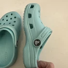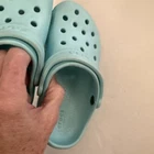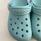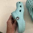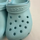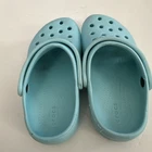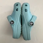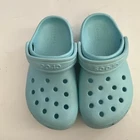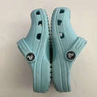 The product is a pair of Crocs clog shoes designed for toddlers in a US shoe size 11. These aqua-colored shoes are made of synthetic rubber material, making them durable and easy to clean. The clog style provides easy slip-on functionality and comfort for little feet. Perfect for casual wear, these unisex shoes offer a versatile option for young children to wear on various occasions.