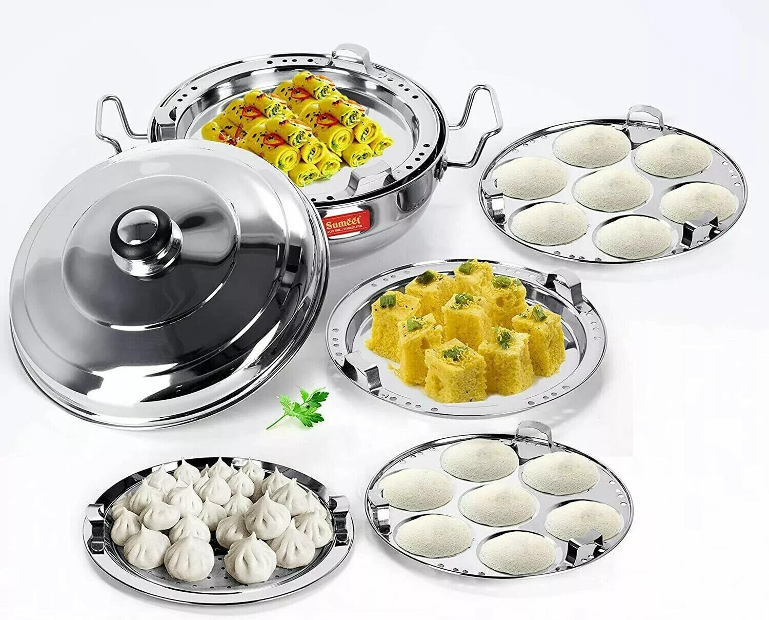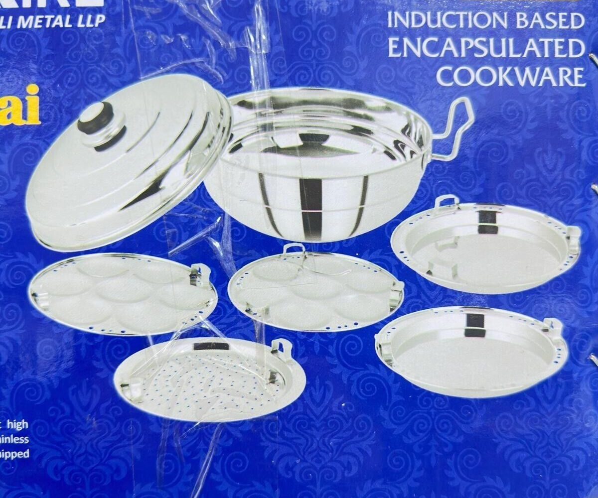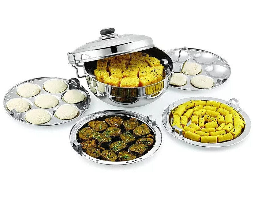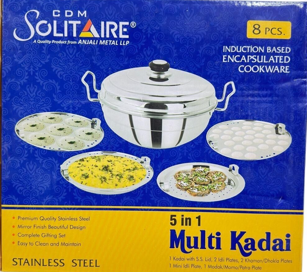 Dhokla Patra Kadai Idli Momo Plate 7pcs Stainless Steel 5 in 1 Multi Purpose 5 in 1 Multi Kadai Multi-purpose cook n serve set. Cooks Idlis, Dhoklas, Patras & various other dishes. Heavy gauge thermal base for uniform heat-distribution & heat retention. Fast & energy efficient cooking. Energy efficient & Induction compatible sandwich base. Professionally manufactured using High Quality & Heavy Gauge Stainless Steel. Material: Stainless Steel. Package Contents: 1 Pc Kadai with SS lid + 2 Idli Plates + 2 Khaman / Dhokla +1 Mini Idli Plate + 1 Modak / Momo / Patra Plate.