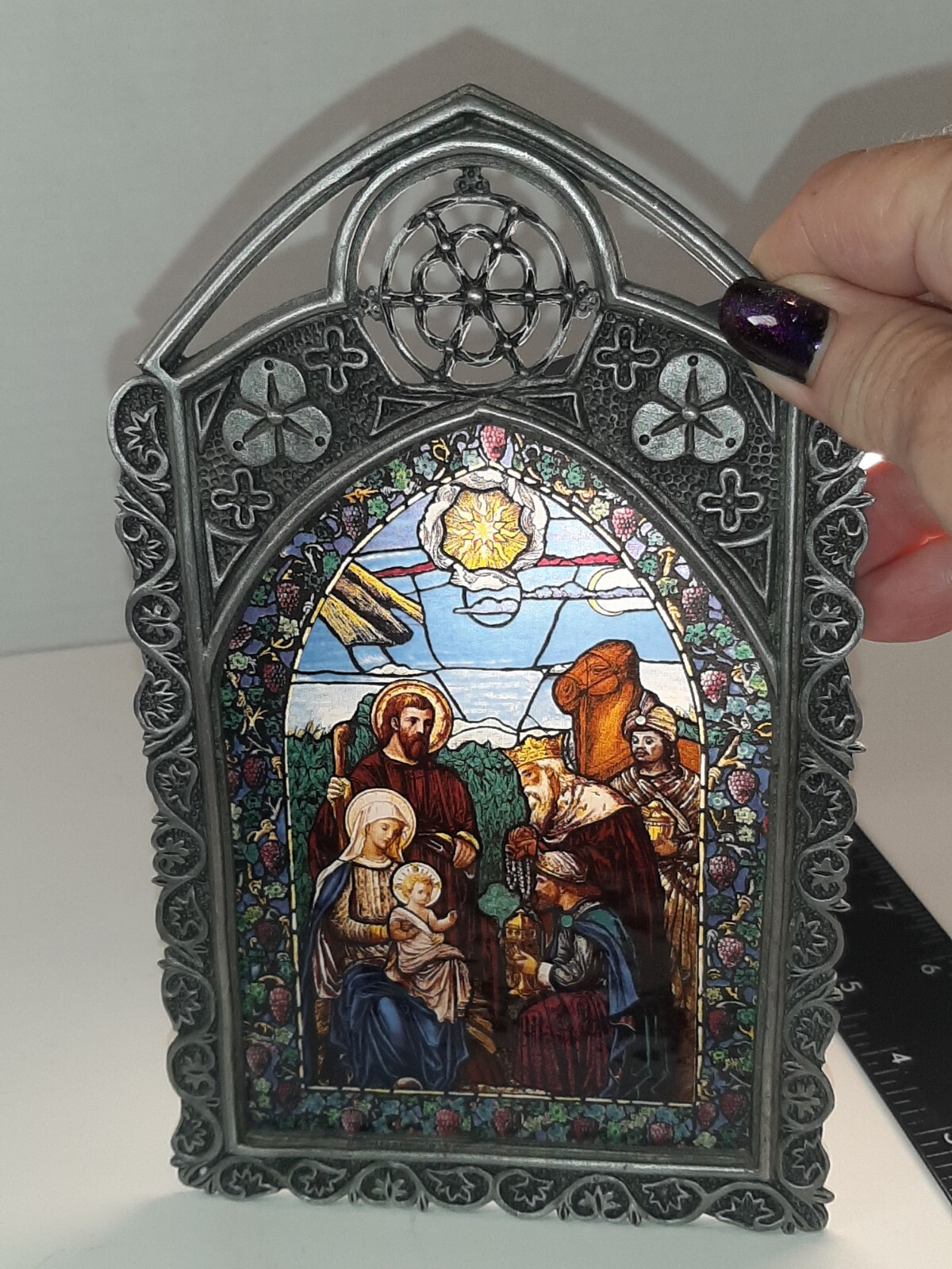 Divine Light The Bradford Exchange 1995 A Savior is Born Stain Glass Pewter READ In good pre-owned condition may show signs of wear from use/handling/storage/display. Please view all pics for condition/details/flaws/issues. SOLD AS IS There was supposed to be a chain off the back for hanging it is missing and broken off there is discoloration, surface scratches, dirt/debris to item. There is/maybe marks/spots/dirt/debris please see photos 1-14, there is/maybe paint loss/sticker loss please see photos 1-14, there is lite discoloration please see photos 1-14, there are surface scratches to item please see photos 1-14, please see all photos for condition/issues/details. I