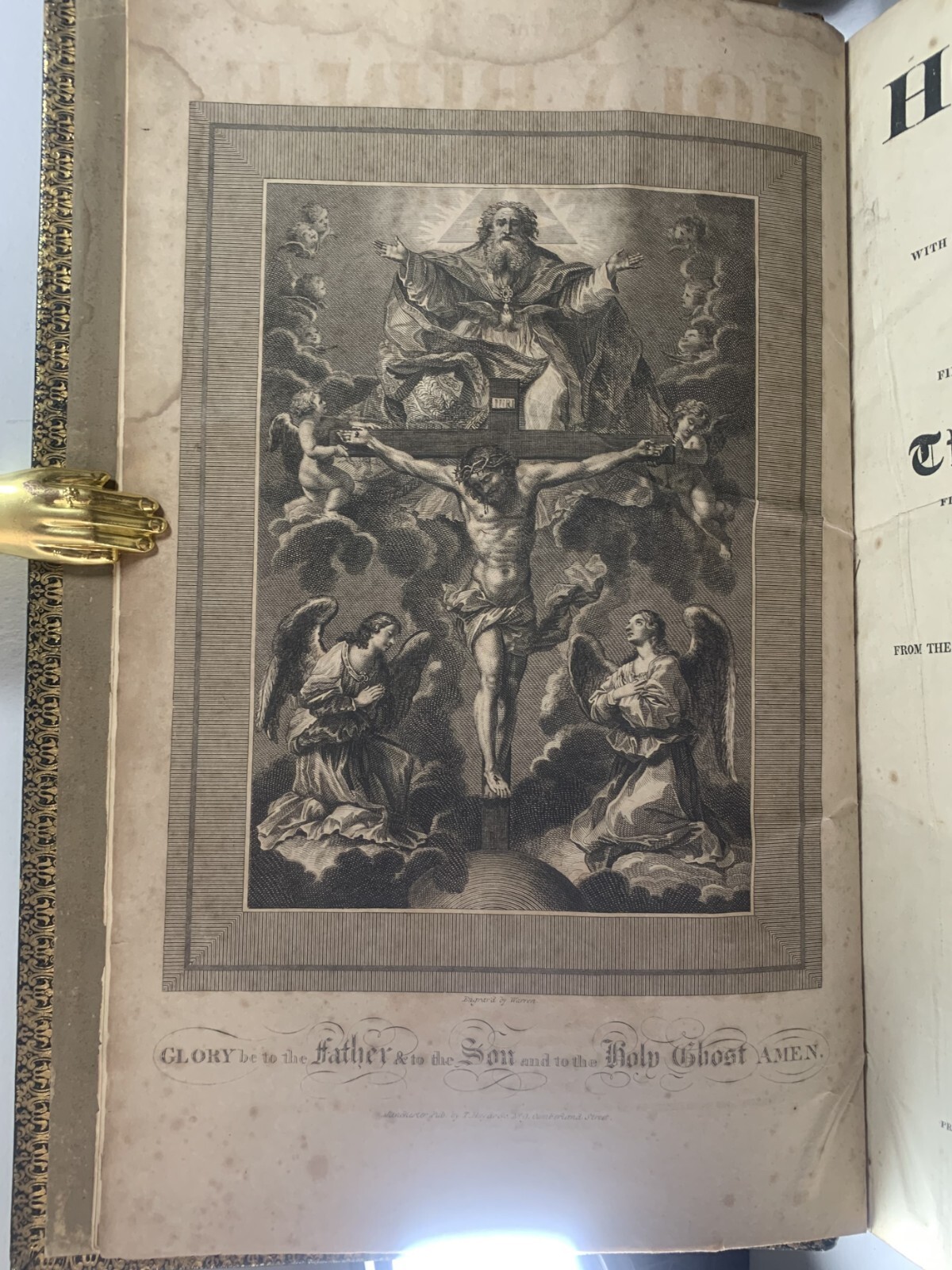 Douay Rheims Old Testament Only Latin Vulgate Folio Bible, Dated 1811: This is a fantastic example of a Douay Rheims Folio Bible! The Holy Bible : translated from the Latin Vulgate, diligently compared with the Hebrew, Greek, and other editions in divers languages. The Old Testament, first published by the English College at Douay, A.D. 1609 : and the New Testament, first published by the English College at Rheims, A.D. 1582 / with useful notes, critical, historical, controversial, and explanatory, selected from the most eminent commentators There are multiple beautiful engravings, designed by Warren. The engraver could be either Charles Warren or Ambrose Warren. Both of whom were engravers based in London at the time. There is beautiful gilding along the edges of the pages and amazing golden vine designs along the edge of the cover. There is an inscription: A M D G (Ad Maiorem Dei Gloriam) London 3 May 1839 Mr. (Illegible for me) (Staunton?) Could be Michael John Staunton, an Irish publisher and Irish nationalist, who at this date would have been hiding from British authorities. Herbert Catalogue - 1579 The text is 100% legible with no pages missing. Dimensions: Weight - 5.2kg Height - 44cm Width - 27.5cm Thickness - 6.2cm Damage: Wearing on the covers Appears to be a damaged leather "patch" on the spine that appears to have the first part of a date on it. Foxing There is some staining, it looks as if it were bleeding from the text itself to the surrounding areas. Around half way through the Bible there is a ripped page.