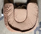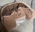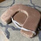 Brown minky twin nursing pillow with a built in/velcro removable privacy nursing cover with an elastic neck strap. Double Blessings brand - super nice. I used this maybe 5 times with my twins. There’s a side pocket on one side and elastic for storage on the other side, a back support and an adjustable strap. I’ll include the original bag that it came with that it has been stored in. The original bag is plastic and is starting to crack from being in storage. The nursing pillow itself is in really good condition. No stains, rips, tears.