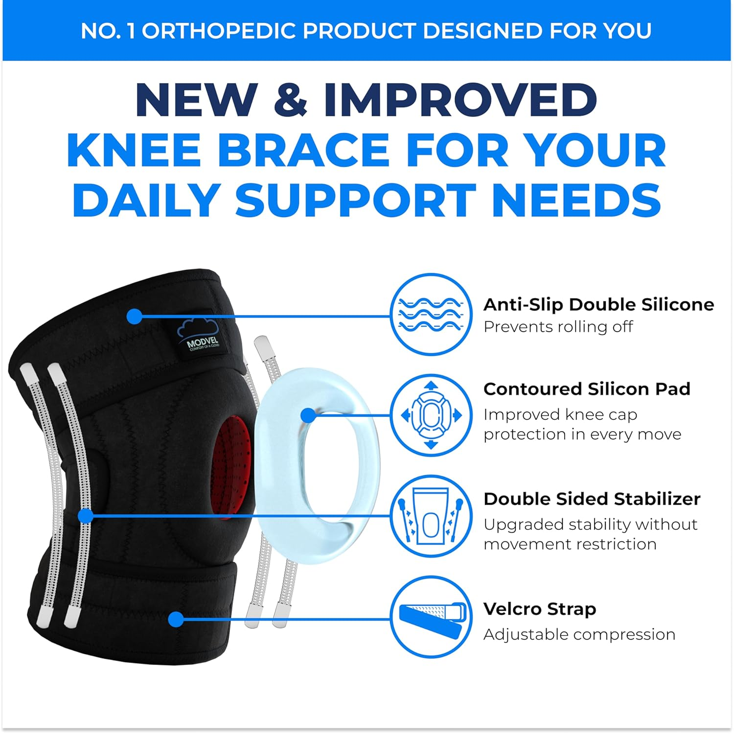 ELITE Knee Brace for Men & Women – Patella Gel Pads & Side Stabilizers for ACL, Meniscus Tear, Arthritis & Injury Recovery – Maximum Support for Running, Sports & Joint Pain Relief Relieve joint pain - Our adjustable knee brace with side stabilizers & Patella Gel Pads provides optimal support for meniscus tear, ACL injury, & arthritis. A stabilizing knee brace for bone-on-bone support, find relief with our innovative design. Comfort & support - A snug fit with its 3-strap system & high-quality hook & loop fasteners. It retains heat to relax muscles & increase blood flow, aiding in joint recovery & relieving pain from activities like basketball, football or tennis. Enhance performance - Our best compression knee brace caters to various sports enthusiasts. Whether you're dealing with meniscus tear, MCL sprain, or just general knee pain. Our ACL knee support brace promotes a swift recovery & reducing inflammation Perfect fit for men & women - Designed sports knee brace for men and women or women plus size. Say goodbye to discomfort and hello to support with our knee brace for meniscus tear, providing relief for everyday activities and intense workouts Optimize movement - Ensures a great fit with side stabilizers & patella gel pads, relieving pain for those suffering from arthritis, patella dislocation or meniscus tear. Hitting the gym or recovering from a knee injury, it offers support you need. Product Description Trusted Bestselling Modvel Products To Choose From: Add to Cart Add to Cart Add to Cart Add to Cart Add to Cart Add to Cart Customer Reviews 4.2 out of 5 stars 1,863 4.3 out of 5 stars 6,887 4.4 out of 5 stars 9,910 4.4 out of 5 stars 5,250 4.4 out of 5 stars 963 4.3 out of 5 stars 807 Price $29.86 $ 29 . 86 $23.93 $ 23 . 93 $22.97 $ 22 . 97 $34.93 $ 34 . 93 $39.93 $ 39 . 93 $19.93 $ 19 . 93 Lifetime Product Support ✔ ✔ ✔ ✔ ✔ ✔ Industry Standard Material ✔ ✔ ✔ ✔ ✔ ✔ 360 Degree Stabilization ✔ ✔ ✔ ✔ ✔ ✔ Optimal Compression ✔ ✔ ✔ ✔ ✔ ✔ Level of Support Firm Support Firm Support Firm Support Adjustable Support Adjustable Support Firm Support Features Washable and durable Breathable compression fabric Breathable & moisture-wicking Adjustable Free lumbar pads 16-hole Breathable Mesh 3D Knit Fabric Benefits Unique compression technology Optimal 360 Compression Optimal support for swelling Immediate & lasting relief Instant relief on lower back Optimal 360 Compression Sizes 3 Sizes from Small to XX Large 6 sizes from Small to 3XL 6 sizes from Small to 3XL 6 Sizes from Small - Plus Size 7 Sizes from Small - Plus Size — Number of Items 1 Color A Black Specific Uses For Product Acl,Patella,Meniscus Tear,Arthritis,Pain Relief,Mcl,Knee Support Use for Knee Age Range (Description) Adult Department womens Size Small/Medium Product Dimensions 9 x 5 x 0.8 inches; 6.38 ounces 5.0 inches x 9.0 inches x 0.8 inches. Weight: 6.38 oz Shipping from the USA All of our products are shipped from the USA, ensuring quick delivery to your destination. Payment We offer the following payment methods: PayPal, credit card, bank transfer, and eBay's secure payment system. Free Shipping & Free Returns Shipping within the USA is FREE. Additionally, any return is absolutely free for you. Risk-Free Purchase You have the option to return an item within 30 days without any justification. We cover the return shipping costs! Fast Shipping We ship immediately upon receipt of payment. Generally, the package is delivered within 2-3 days in the USA. If it takes longer, we will contact you. Quality and Costs Made in Europe, USA, China No customs fees or additional charges Total satisfaction guarantee Invoice with declared VAT available upon request in .pdf format Feedback Your feedback is very important to us. After you pay for your purchase, you will automatically receive positive feedback from us.