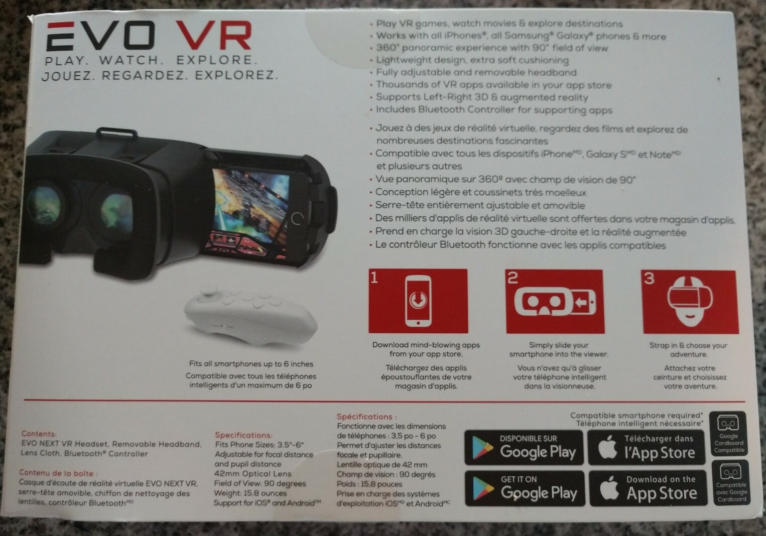 EVO VR Headset For Smartphone. 360 Degree Virtual Reality. Bluetooth Controller. Removable headband, Lens cloth. Fits phone sizes: 3.5 to 6". Adjustable for focal distance. 42 mm. Optical Lens. Support for IOS and Android. Google cardboard compatible. Strap in and choose your adventure. Condition is "New". Good gift. Black Friday priced through Nov.26.