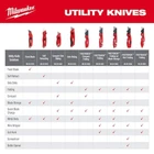 The Milwaukee FASTBACK Compact Folding Utility Knife features a press and flip mechanism for easy, 1-handed opening. The Milwaukee utility knife allows users to make quick, tool-free blade changes for maximum jobsite efficiency with a metal extension over the button to prevent accidental blade removal. The press and flip open utility knifes compact size allows for easy storing while a durable wire belt clip reduces pocket tearing. The small utility knife has a blade holder designed for scoring and includes a lanyard hole for convenient tethering. Includes (4) 48-22-1500 FASTBACK Compact Folding Utility Knife with General Purpose Blade.