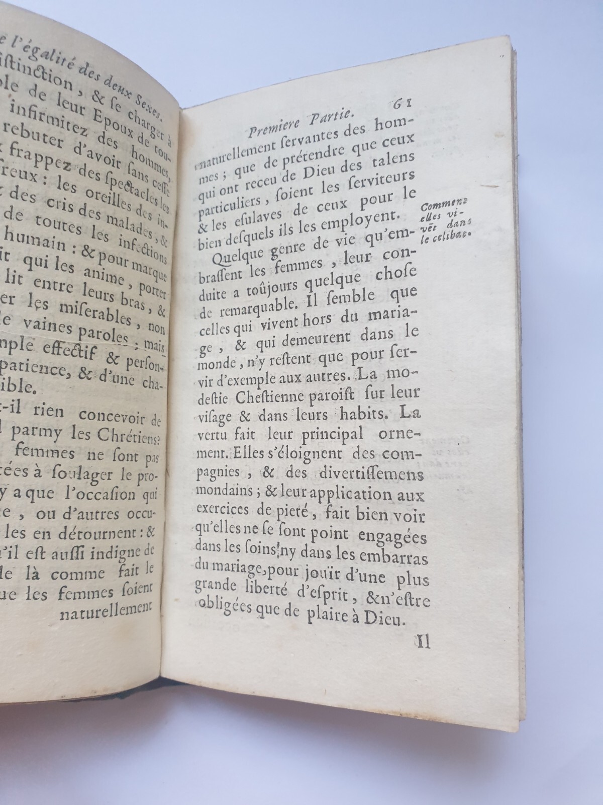 Title: De L’Égalité des Deux Sexes, Discours Physique et Moral, où l’on voit l’importance de se défaire des Préjugez. Author: François Poulain [Poullain] de la Barre Edition: 1676. Publication: Paris: Jean De Puis Description: 221 numbered pages; Preface 10 pages, Avertissiment 4 pages; Extrait du Privelege du Roy 2 pages. 145 X 90 mm; Essential book in the history of feminism, a turning point of feminist argumentation and philosophy. François Poulain de la Barre (b. 1647 in Paris) rejected the dogmatic reasoning style of his scholastic education in writing this foundational feminist text. It is the first of three works, published in succession between 1673 and 1675, in which he makes an argument for the equality of the sexes. While other feminist writers before him called upon religious and philosophical authorities, Poulain was the first to base his argument on reason alone. After its translation in 1677 as The Woman as Good as the Man, Poulain's work became influential in England, where it was widely and enthusiastically plagiarized throughout the eighteenth and nineteenth centuries. "Poulain changed the focus of the debate about women in the seventeenth century. He challenged the factual claims on which opponents of sexual equality relied, rejected the value of appealing to women's nature as if it were something that could be known independently of the properties that were predicated of it, and rejected as invalid any inference from established customs (as mere facts) to a moral or political justification of women's status. Poulain may be described as the first Cartesian feminist" (Clarke). Particularly fascinating about this book is the way in which the Cartesian doubt that Poulain employs to dispel traditional arguments in favor of gender inequality also has the potential to undermine his own work. In fact, that doubt confirms the book's philosophical credibility while also making room for further advancements in feminist thought. Condition: Please see pictures.