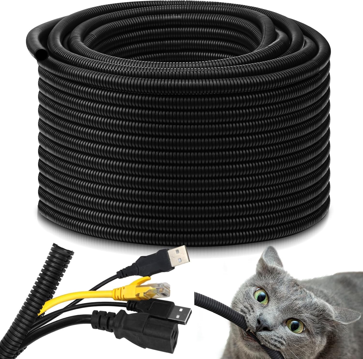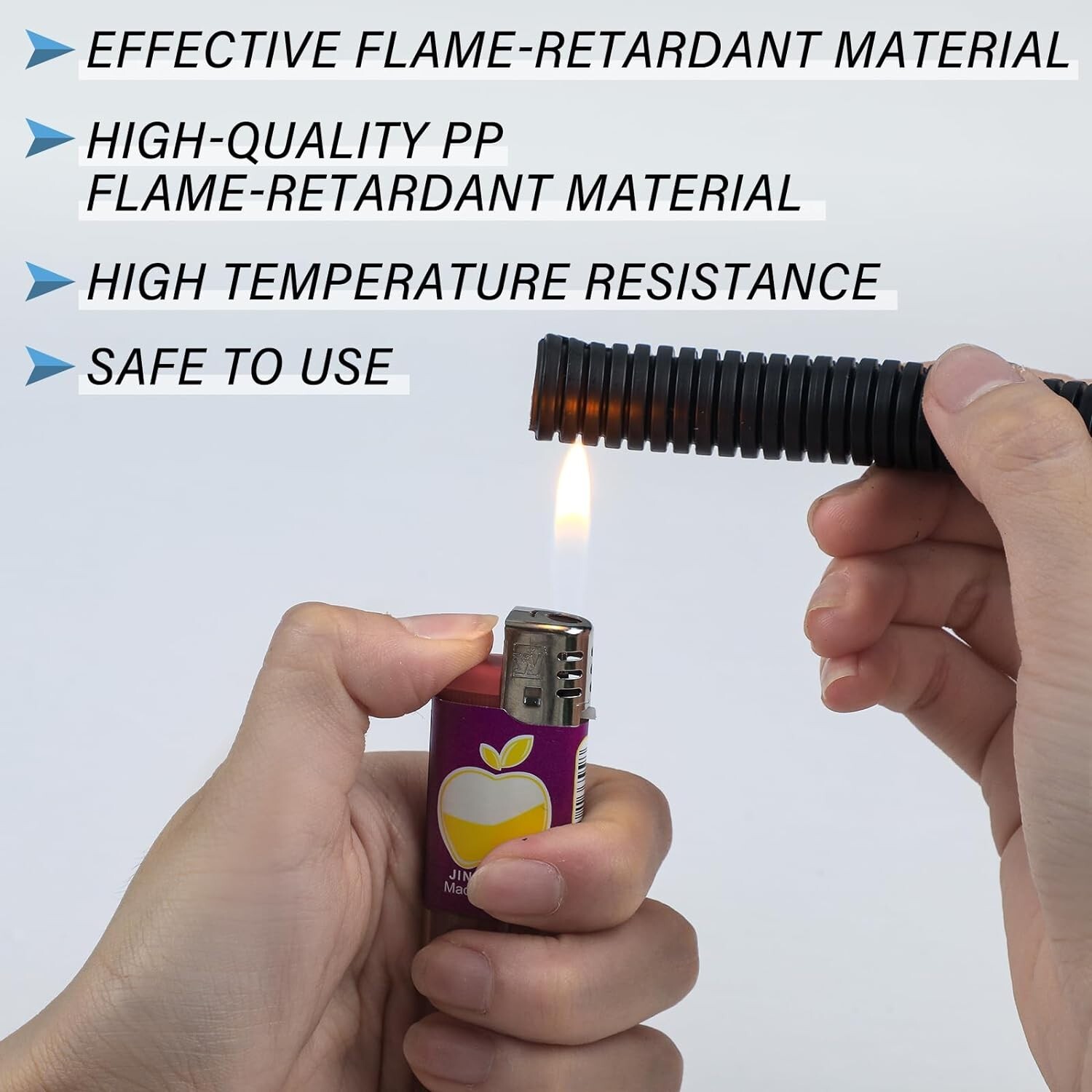 Flame Retardant Wire Loom High Temperature Cable Conduit Split Cable Sleeves Split Wire Loom Tubing Auto Wire Conduit for Industrial Electrical Wires Automotive Marine Black,1/2''-100 ft High Temperature Resistant and Flame Retardant: the wire wrap is made of quality high temperature resistant polypropylene material, which features flame retardant; It can not only be applied as car wiring, but also suitable for protecting wire harnesses for machine tools, electrical power, and household appliances Wider Operating Temperature Range: these wire covers for cords can adapt to a wider working temperature range, which can be applied in -22 to 230 degrees Fahrenheit; Our wire protector is suitable for wire and pipe protection in fields such as automobiles, ships, industry, offices, homes and more Detailed Size: the wire sleeve measures about inches in inner diameter, about inches in outer diameter, about 100 feet in length, made of thickened polypropylene with nice toughness, which can be bent arbitrarily and is not easy to twist, suitable for different wires and cables Durable Wire Protector: featuring flame retardant, wear resistant, corrosion resistant, oil resistant, this wire protector tubing is suitable for indoor or outdoor wire sheathing, and its flame retardant performance is ideal for protecting wires Easy and Convenient to Install: our wire covers for cords adopt a split opening design and has side cut for easier use, making these cable sleeves for wires easy to put wires in, convenient for you to install