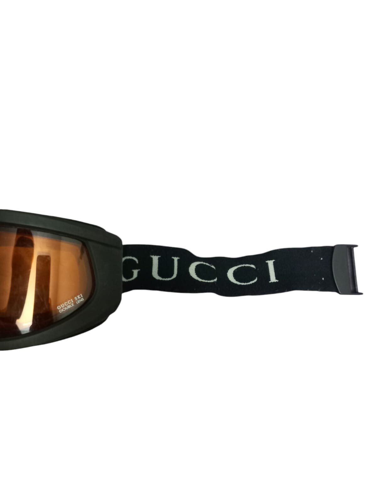 The Gucci Ski Snowboard Goggles feature a vintage design with a black frame and orange tinted lenses, perfect for winter sports like skiing. These unisex adult goggles offer UVA protection and are made with lightweight plastic frames and glass with mirror lens material. The shield style goggles are personalized with the Gucci logo, adjustable for a comfortable fit, and ideal for enhancing visibility on the slopes. These high-performance ski goggles are crafted in Slovenia and cater to both style and function for winter sports enthusiasts.