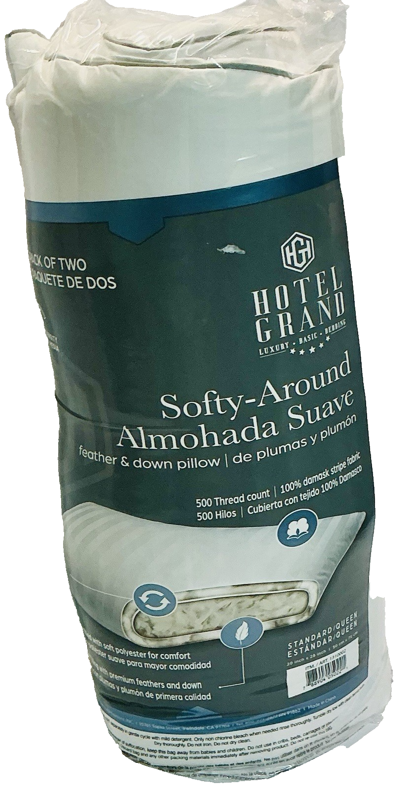 Hotel Grand Feather & Down Pillow, 2-pack - Standard/Queen 20 x 28 in - 500 TC. Condition is New with tags. free shipping The Hotel Grand Feather & Down Pillow 2-pack in Standard/Queen size features a luxurious striped pattern on a rectangular shape, filled with a mix of down and feathers for ultimate comfort and support. The pillows are in a stylish white color, perfect for any bedroom decor. With a high thread count of 500, these pillows are not only soft but also hypoallergenic, making them ideal for adults looking for a cozy and modern sleeping experience. Easy to care for with machine washable and tumble dry features, these pillows are a perfect addition to any bedroom.