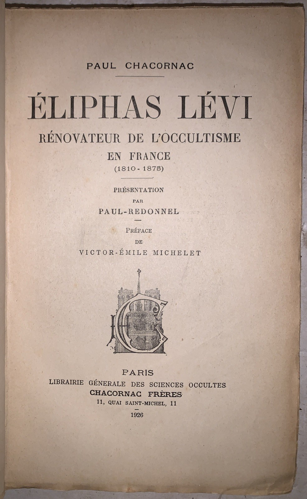 Éliphas Lévi, Rénovateur de l'occultisme en France (1810-1875) by Paul Chacornac Présentation par Paul-Redonnel Préface de Victor-Émile Michelet Paris: Librairie Géneral Des Sciences Occultes, Chacornac Frères 1926 First Edition Presentation copy with signed inscription by the author to A. E. Waite. The inscription reads "A Monsieur A. E. Waite. L' admiration sincere d' Eliphas Lévi sou biographe: P. Chacornac." Octavo, xviii, 300 pages, gilt lettered red cloth covered boards. Illustrated throughout in black-and-white. Text in French. Some discoloration to endpapers, spine sunned, some occasional discoloration, corner bumped, else in very good + condition. If you have any questions, feel free to ask, and don't forget to check out my other listings.
