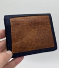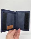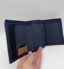 John Weitz Poly Trifold Wallet W Embossed Leather Panel of a man fishing. Dark navy blue poly sport fabric. Velcro closure. Slim wallet w bills and credit card holders. New w/o tags.