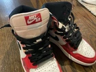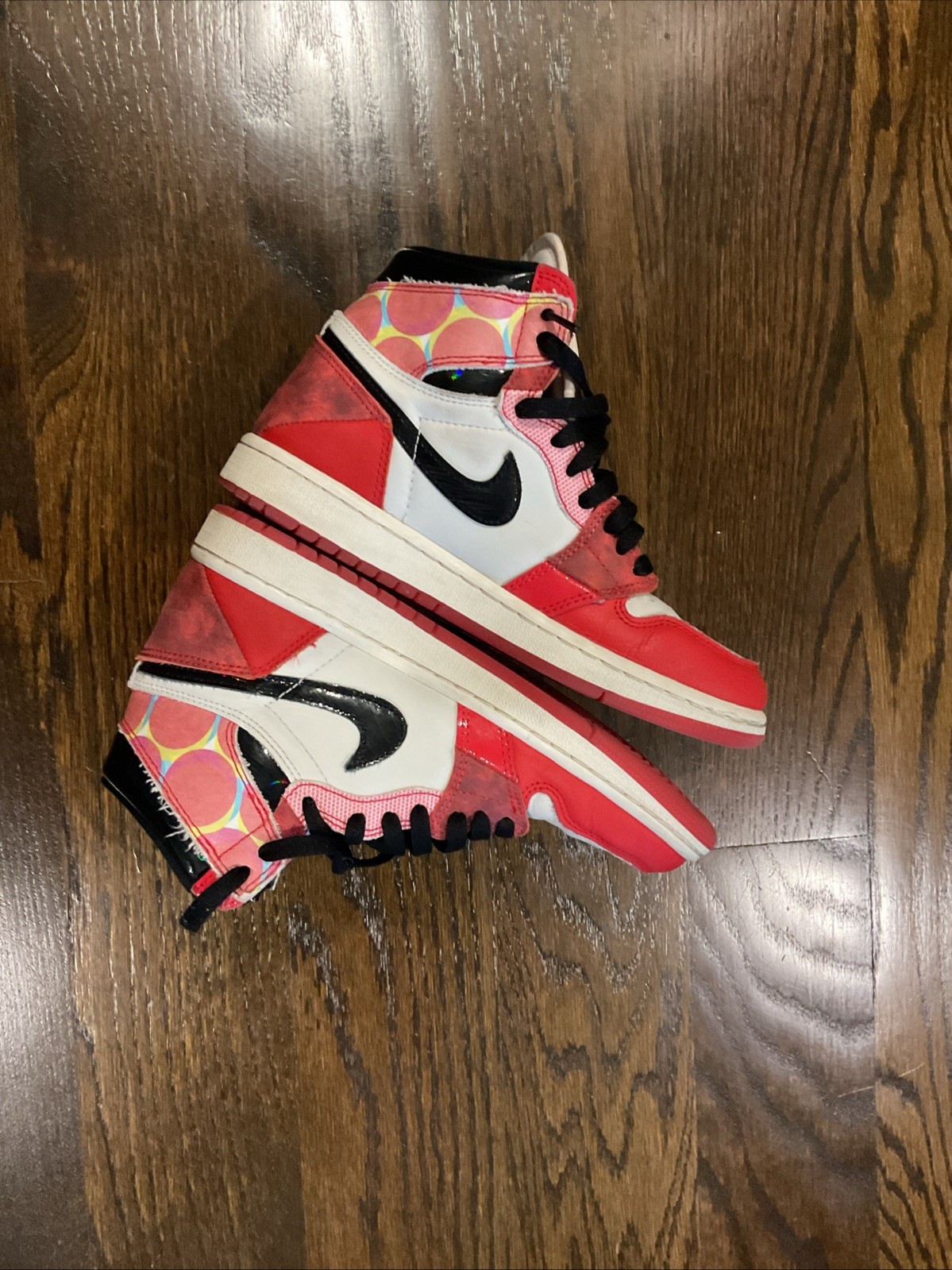 The product is a pair of Jordan 1 Spider-Man sneakers in size 6, featuring a round toe shape, lace-up closure, and high-top shoe shaft style. The shoes are made of a blended fabric with a rubber outsole, providing comfort for casual occasions during the summer, fall, and spring seasons. The design includes the iconic Spider-Man character, colorblock pattern, and logo accents, making them a stylish choice for young boys who are fans of the superhero. The shoes have a standard shoe width and leather upper material, showcasing the signature Nike Air Jordan 1 model with a Spider-Man theme.