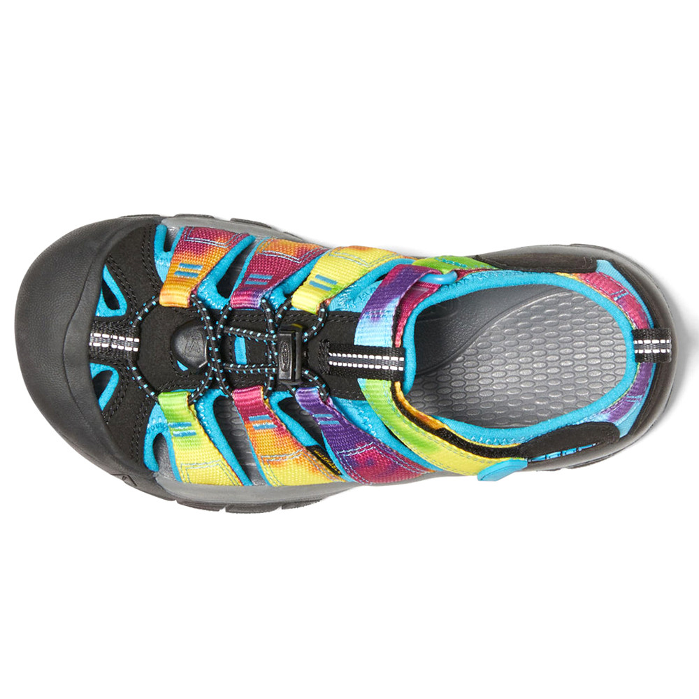 Newport H2 Tie-Dye Fisherman Sandals (Big Kid) Product Details Washable polyester webbing upper Slip on entry EVA insole Non marking rubber outsole Color: Rainbow Tie Dye Newport is the official sandal of summer and summer camp,all about fun and worry free protection and comfort. From trail to treehouse to tire swing, they’re covered…and comfortable. Additional Details Manufacturer Color: Rainbow Tie Dye Color: Blue, Multi, Pink, Purple, Yellow Occasion: Casual Gender: Girls Age: Youth Brand: Keen