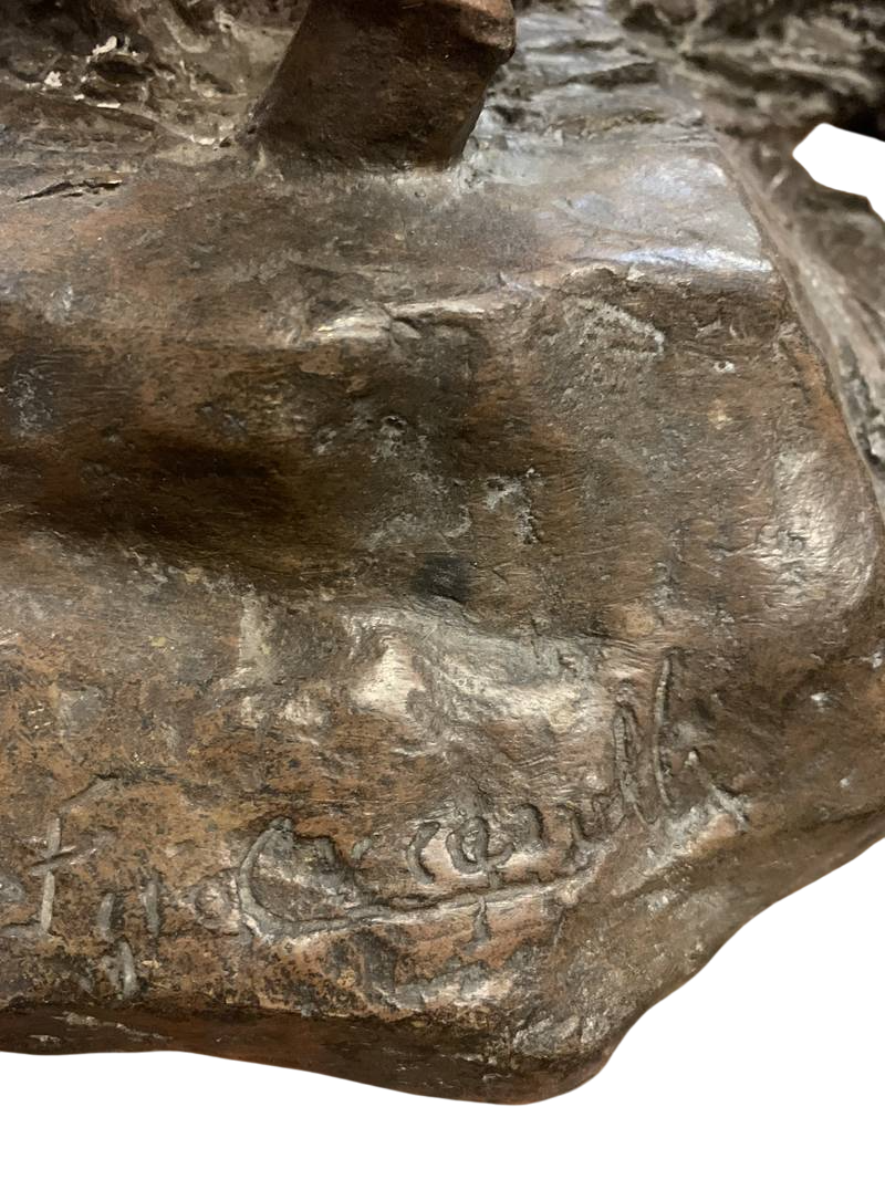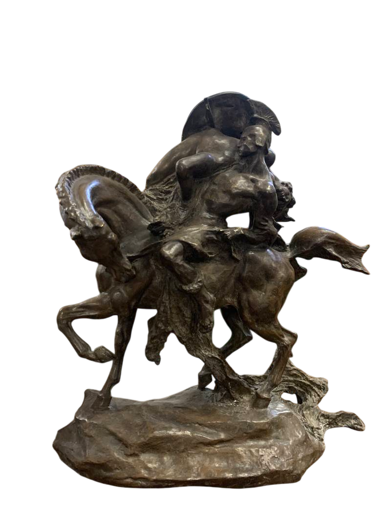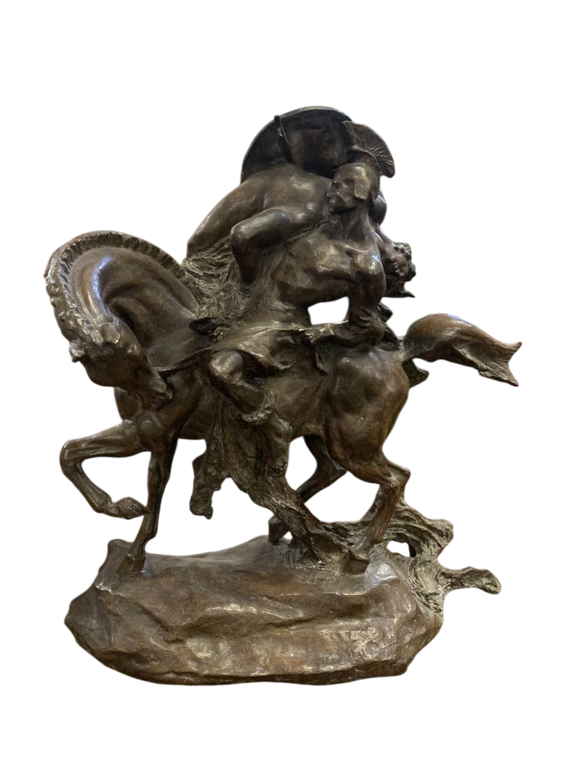 Grande scultura in bronzo Il ratto Firmato Ezio Ceccarrelli 1865 - 1927 Importante grande scultura in bronzo scuro in patina Ezio Ceccarelli . (1865 - 1927). Biografia : Ezio Ceccarelli (1865-1927), nato a Montecatini Val di Cecina, è stato uno scultore italiano che ha iniziato il suo apprendistato presso l'Academy di Rivalta e Bortone a Firenze, città che amava particolarmente, diventando poi lui stesso insegnante presso la Scuola Industriale d'Arte di Volterra. Oltre alla sua attività di insegnante, ha fondato uno studio di scultura a Firenze, accogliendo studenti e collaboratori. Grazie a questo laboratorio e ai riconoscimenti che ne derivano, partecipa a numerosi concorsi, tra cui quello per la statua di Re Carlo Alberto a Roma, vince il primo premio Curlendese a Bologna nel 1899 e, soprattutto, la medaglia d'oro per la statua Ecce Homo al concorso Gregoriano di Roma. Il suo virtuosismo e la sua fama si sono diffusi in lungo e in largo, grazie alla partecipazione a numerosi concorsi internazionali, tra cui quelli di Liegi, Copenaghen e Atene. An He rappresentò l'Italia all'Esposizione Universale di Parigi, esperienza che ripeté nel 1904. Forte di questo successo, scolpì o progettò diverse sculture civili per città italiane, tra cui un Garibaldi per Massa nel 1905, un Carlo Montanari per Verona e un Christopher Designs per La Plata in Sud America. Bibliografia : A.Panzetta, Dizionari Degli Scultori Italiani Dell'Ottocento, Torino, ed. Umberto Allemandi, 199 199 Concorso Gregoriano di Roma ottiene con Noli me tangere il primo premio medaglia d'oro Nel 1902 Ceccarelli torno' a Torino per partecipare all'importante 1 Esposizioe Quadriennale che fu significativa vetrina del Simbolismo italiano , vi aderirono Pelizza, Innocenti, Kienerk e Previati, i consensi suscitati nell'ambiente piemontese sono altresi ' documentatei da due sculture bronzee conservate presso la Galleria Reinaudo di Torino Codice prodotto : BL_497761