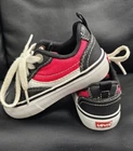 Levi's toddler shoes in white, black, and red color with a low top sneaker style and lace-up closure. These unisex casual sneakers feature the Levi's logo accent and are made of lightweight faux suede material. The shoes are a UK size 6, US size 7, and EU size 23, suitable for toddlers. Perfect for all seasons, these colorful Levi's toddler shoes provide a stylish and comfortable option for little ones.