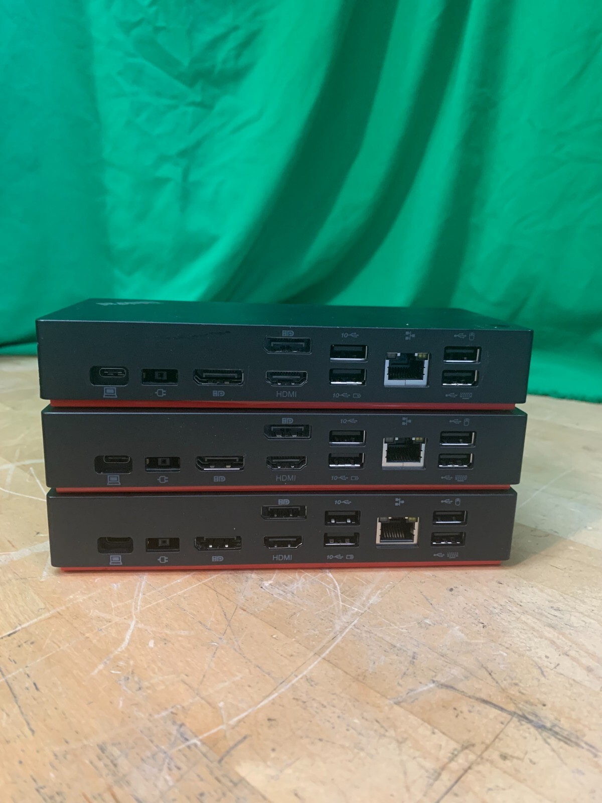 ---------------------------------------------------------------------------------------------------------------------------- **LOT OF 3** Lenovo ThinkPad Universal USB-C Dock 40AY No AC Adapters Manufacturer Lenovo Type USB-C Part Number 40AY Inventory PAllet MOST OF OUR SHIPMENTS ARRIVE IN 2-DAYS OR LESS! ----------------------------------------------------------------------------------------------------------------------------------------------------------------------- PAYMENT & SHIPPING: PayPal is the only acceptable payment method and we only ship to a confirmed buyers address that is verified by PayPal. No exceptions! Payments must be made within 3-days of auction closing. All non-payment members will be added to our blocked list and banned from future eBay purchases. Tracking information will be posted on eBay. FEEDBACK: Feedback is left for buyers that leave Resale Technologies feedback. If for some reason there is an issue with your order please do not hesitate to contact our support team and we will be happy to resolve your issue swift and efficiently. RETURN POLICY We accept returns on all items that qualify for our 30 Day Warranty. We will pay return shipping to our facility for any item that is defective, damaged, or misrepresented in our eBay listing. Items will be repaired, replaced, or refunded. This warranty does not apply if shipped outside the United States. For all other returns, shipping will be paid by the customer and may be subject to a 20% restocking fee. CONTACT US If you have any product questions, please reach out through eBay and we will assist however possible. NOTE: ALL ITEMS THAT WE SELL ARE ASSIGNED AN UNIQUE IAT (INTERNAL ASSET TAG) THAT MUST MATCH WITH OUR INVENTORY SYSTEM IN ORDER TO RECEIVE FULL CREDIT OR EXCHANGE. OUR IAT'S TRACK SERIAL NUMBERS, PARTS/PERIPHERALS, AND CONDITIONS OF EACH ITEM SOLD. **PHOTOS SHOW THE EXACT DOCKS YOU WILL RECIEVE** **SOLD AS IS FOR PARTS BECAUSE ONLY TESTING DONE WAS FOR POWER, AND THEY WERE PULLED FROM WORKING ENVIRONMENTS** **PLEASE MESSAGE US BEFORE PURCHASE IF ANY QUESTIONS, THANK YOU!**