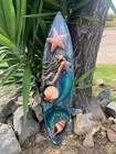 This beautiful hand carved and painted surfboard wall plaque is perfect for Mermaid lovers. The mermaid is beautifully airbrushed in great Detail. It would make a great addition to your home, patio, or tiki bar. It is hand carved from top-of-the-line mango wood, and has a flat back to hang on the wall. This surfboard would make an awesome gift! Can be hung horizontally or vertically. Let us know if you need an extra bracket for horizontally. 39x 10 inches Will eventually start to fade if left out in the sun. We highly recommend an polyurethane gloss spray with UV protection for upkeep.