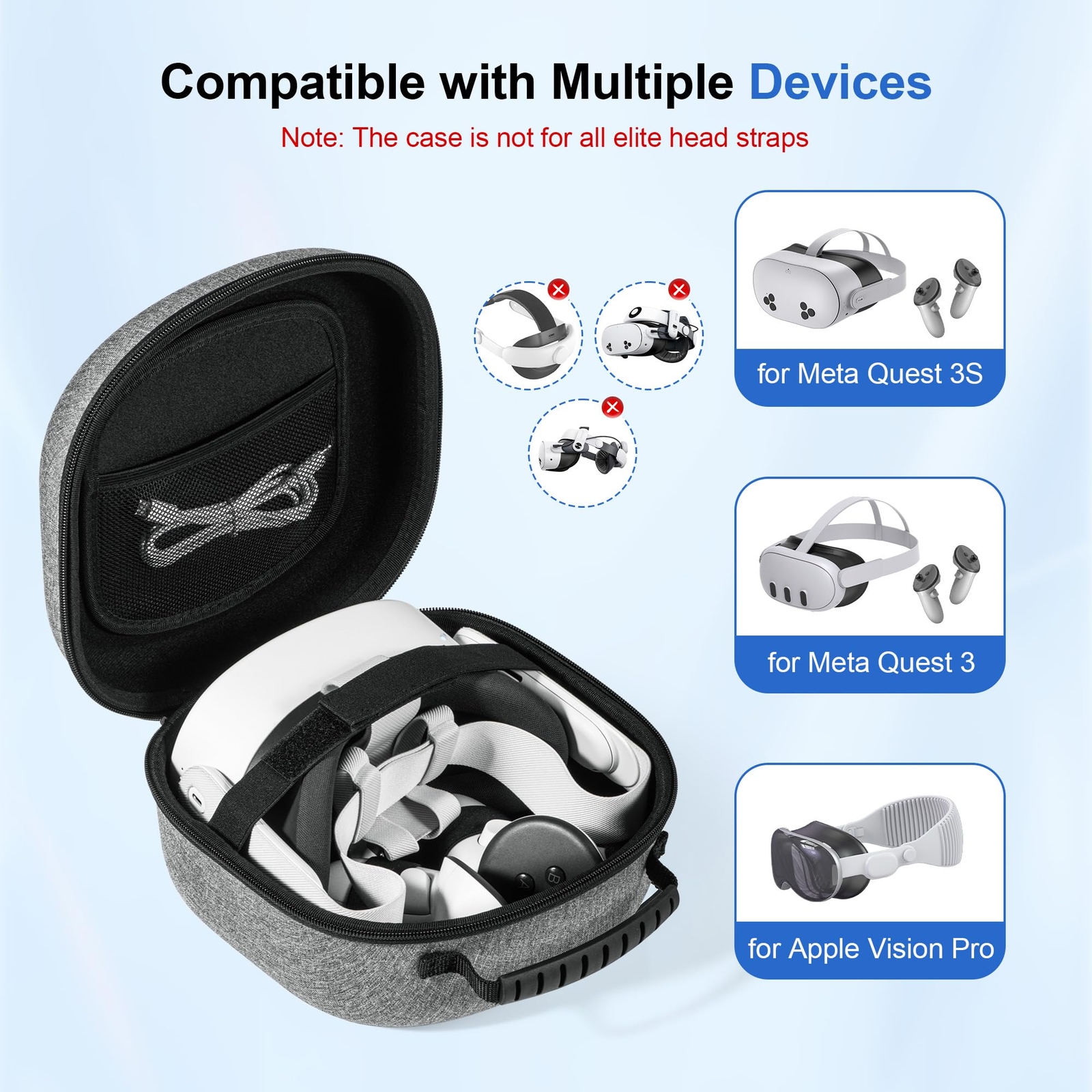 Portable Carrying Case for VR Gaming Headset: This carrying case is specially designed for Meta Quest 3S/Quest 3/Vision Pro VR headset and other accessories. NOT Compatible with elite strap or any other all third-party head straps with batterySmall Space, Large Capacity Design: The travel case for Oculus Quest 3S/Quest 3/Vision Pro perfectly fit VR headset, original cloth head strap, controllers, charger, cables (Case only, accessories are not included). Sturdy and Safe: The hard shell case for Quest 3S/Quest 3/Vision Pro is made of high-quality material with elastic strap design to better stabilize the VR headset and other accessories, the soft inner lining effectively prevents your device from scratches and securely protects your device. Space-saving and Easy to Carry: This travel bag features a comfortable, non-slip silicone handle that relieves hand fatigue. The space-saving design of the travel bag is very convenient for traveling, whether you carry it in your hand or put it in your suitcase. The Ideal Present: Ideal for a birthday surprise, holiday present or treat yourself. This case is an ideal present for VR gamers who want their device to be both secure and stylish.