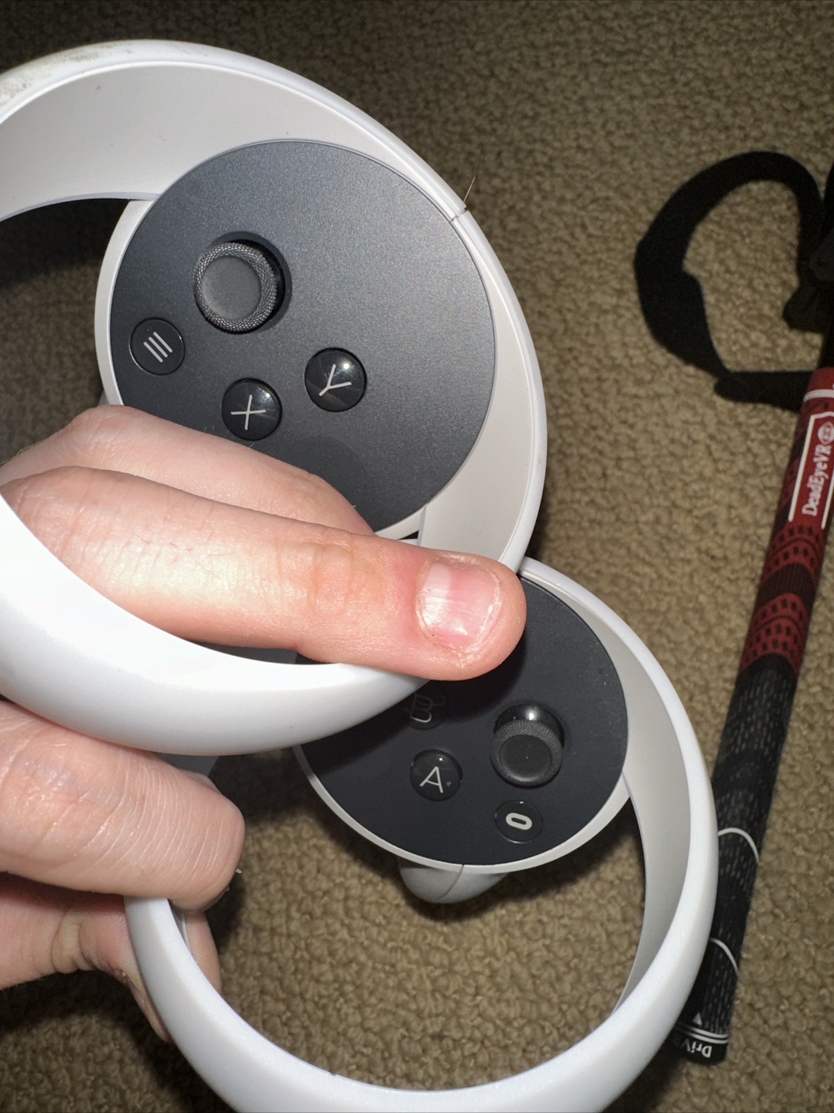 Meta Quest 2 comes in the box with original 2 controllers, headgear, a Golf+ (the game) golf grip so you can play with a real feel. Also comes with wireless charged battery, new more comfortable head strap, and glasses separator. This if the full kit to just playing VR at its finest