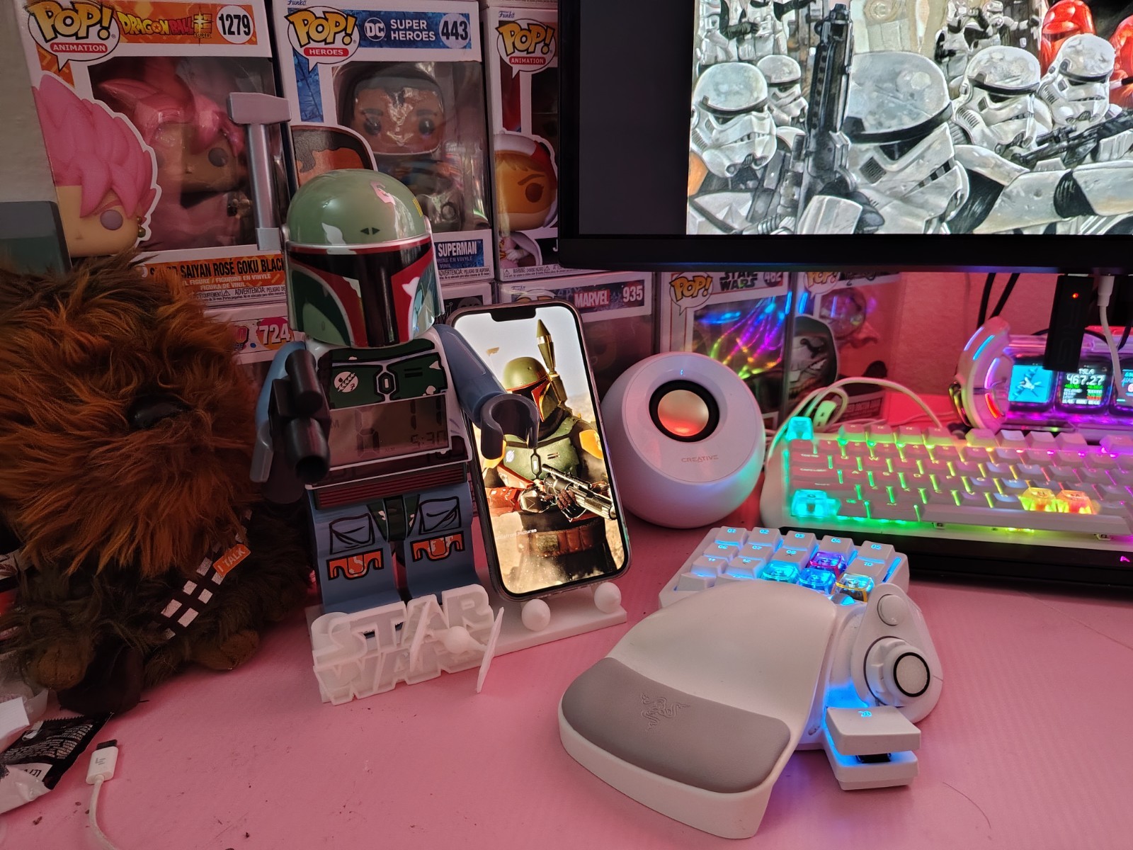Lifetime warranty! Includes gun or lightsaber Fits Lego clock figure perfectly and snaps in Features a cell phone holder shape of r2d2 and Boba fetts gaffi sticks Single color model can be custom produced in any color. Material: plastic. Non-toxic. Food safe. Manufacturing country: US Material origin: CHN
