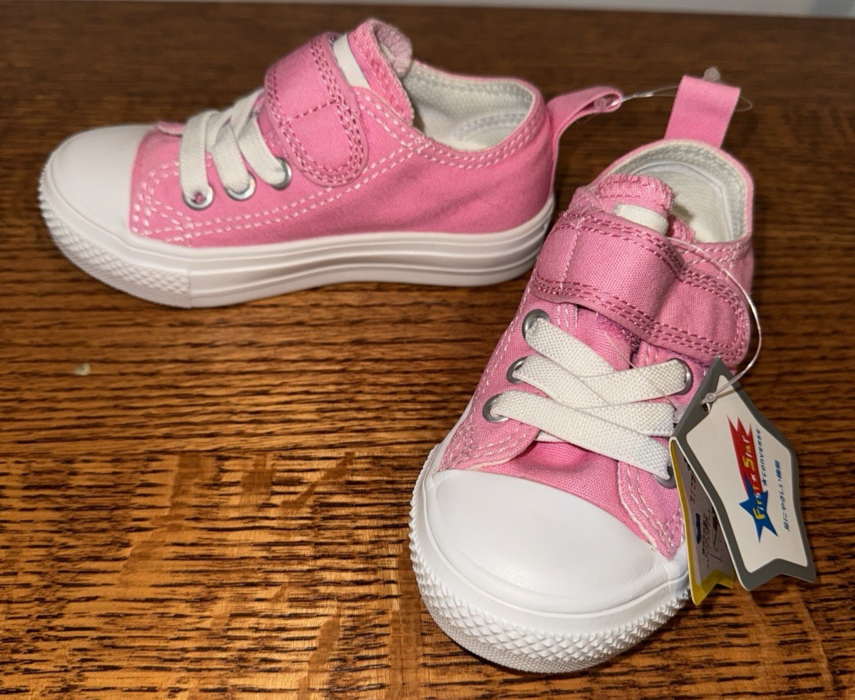 NWT Toddler Girls Converse Pink First Star All Star Toddler Shoes Size 8 Hook and loop closure plus tieless shoelaces for adjustable fit. Soft, foam underfoot cushioning helps support comfortable play Converse shoes bought in Japan Size: US 8 Free Shipping!