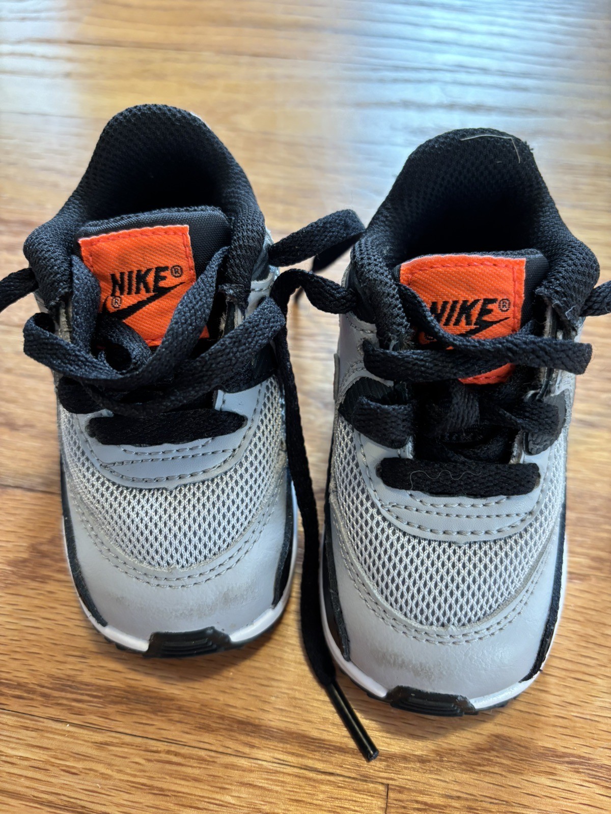 The Nike Air Max Infant/Toddler Shoes are unisex baby and toddler running shoes in a stylish grey color with black and orange accents. Made with synthetic and rubber materials, these shoes feature the iconic Nike Air Max 90 model with a medium shoe width. Perfect for active young ones, these shoes provide comfort and support for everyday wear or playtime.