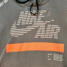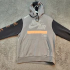 Nike pullover hoodie featuring a stylish design. This hoodie showcases a gray body with contrasting black sleeves, adding a modern and sporty touch. The front features a Nike graphic with an orange accent stripe, while the left sleeve boldly displays the Nike logo in orange lettering. The back is plain gray. It includes a drawstring hood and a kangaroo pocket for added convenience and warmth. Measurements: * Pit to pit: 22 inches * Length: 27 inches Type: Hoodie Color: Gray Department: Men Style: Pullover Features: Hooded, Graphic Print, Pockets, Adjustable, Drawstring Closure: Drawstring Fabric Type: Fleece Character: Hero, Electro, Pop, Skids, Tommy Performance/Activity: Weightlifting, Cross Training, Running & Jogging, Walking, Gym & Training Keywords: Nike hoodie, pullover hoodie, graphic hoodie, block sleeve hoodie, gray hoodie, black hoodie, mens medium, Nike Just Do It, athletic hoodie, casual hoodie, sportswear, Nike apparel, hooded sweatshirt all items have been cleaned and disinfected we stand behind all items we sell so please contact us if you have an issue with any order